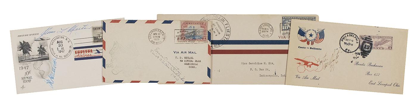 Two items: FDC with a cachet honoring the 10-cent airmail stamp, signed by aviator Glenn L. Martin and US Postmaster General Jesse M. Donaldson; and an air mail envelope sent from the 1929 Los Angeles air show, signed in fountain pen, “Earle Ovington, First U.S. Air Mail Pilot (1911).” Accompanied by an unsigned 1928 air mail envelope with a horseshoe-shaped stamp, “Lindbergh Again Flies the Air Mail” and a cover honoring the 1930 flight of Dieudonne Costes and Maurice Bellonte from Paris to New York. In overall fine condition.