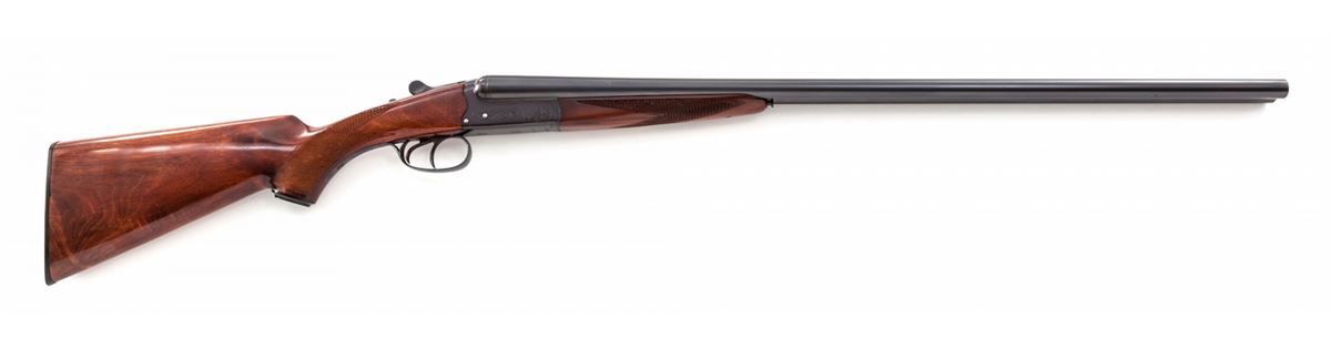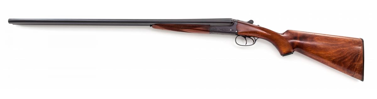 Early B.C. Miroku Side-by-Side Boxlock Shotgun, #410975, 20 ga., 3'' chs., blue finish, 28'' barrels with brass front bead, choked Full/Mod., extractor, double triggers and automatic sliding top tang safety, light scroll engraving on frame; medium-gloss swept pistol-grip stock with splinter forend, 18 LPI checkering, 14'' length of pull over a B.C. Miroku plastic buttplate, weight is 6-1/8 lbs. Condition remains near new with a few small assembly and handling marks; frame blue turning slightly plum. Est.: $600-$800. (Modern)