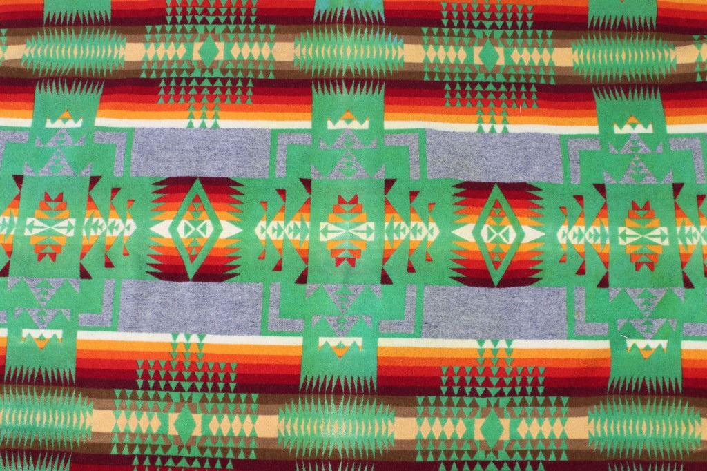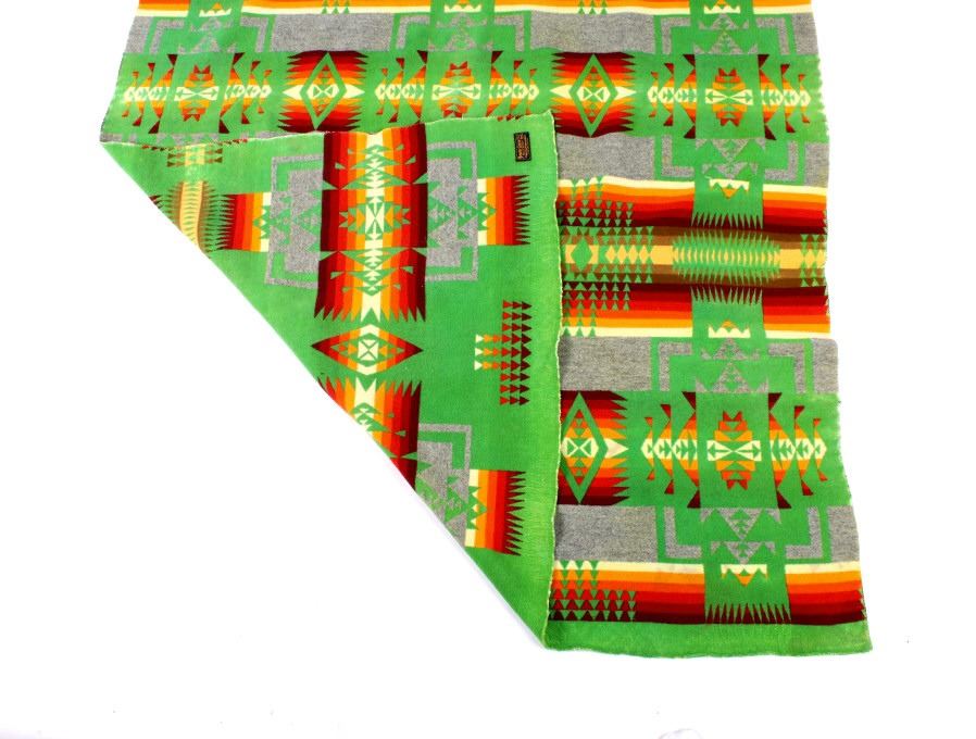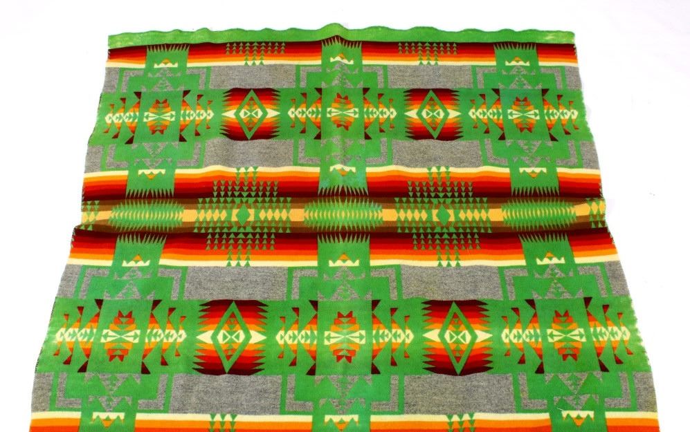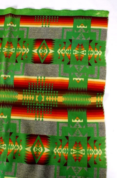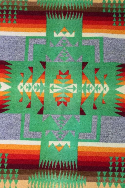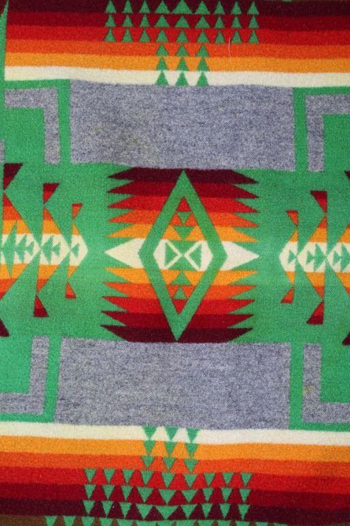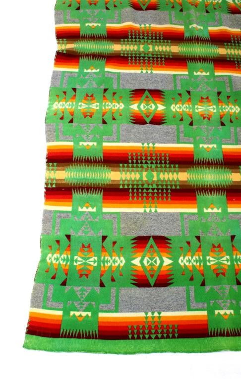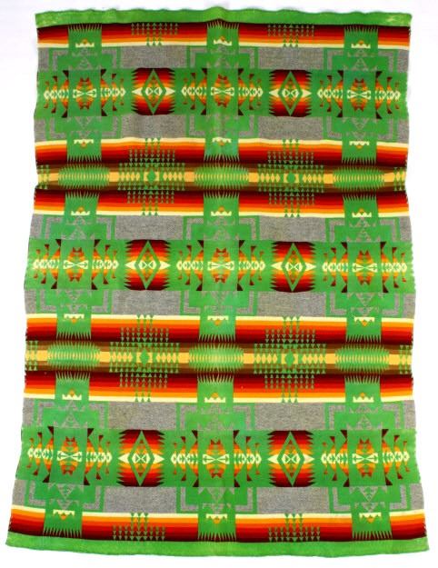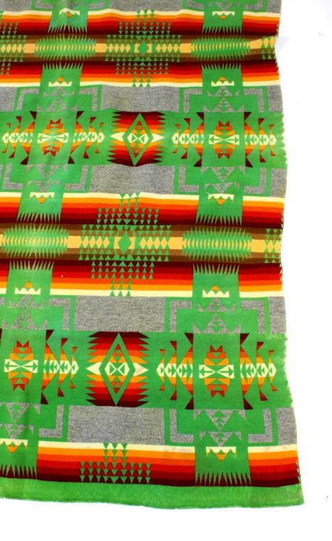 For your consideration is this early Beaver State Chief Joseph blanket in rare lime green. Judging from the tag design, this is a circa 1940's blanket. The tag reads, "Beaver State/ Robes and Shawls/ Reg. U.S. Pat. Off./ Pendleton Woolen Mills/ Pendleton Oregon." The blanket is in excellent condition; it measures 45" x 65.5".