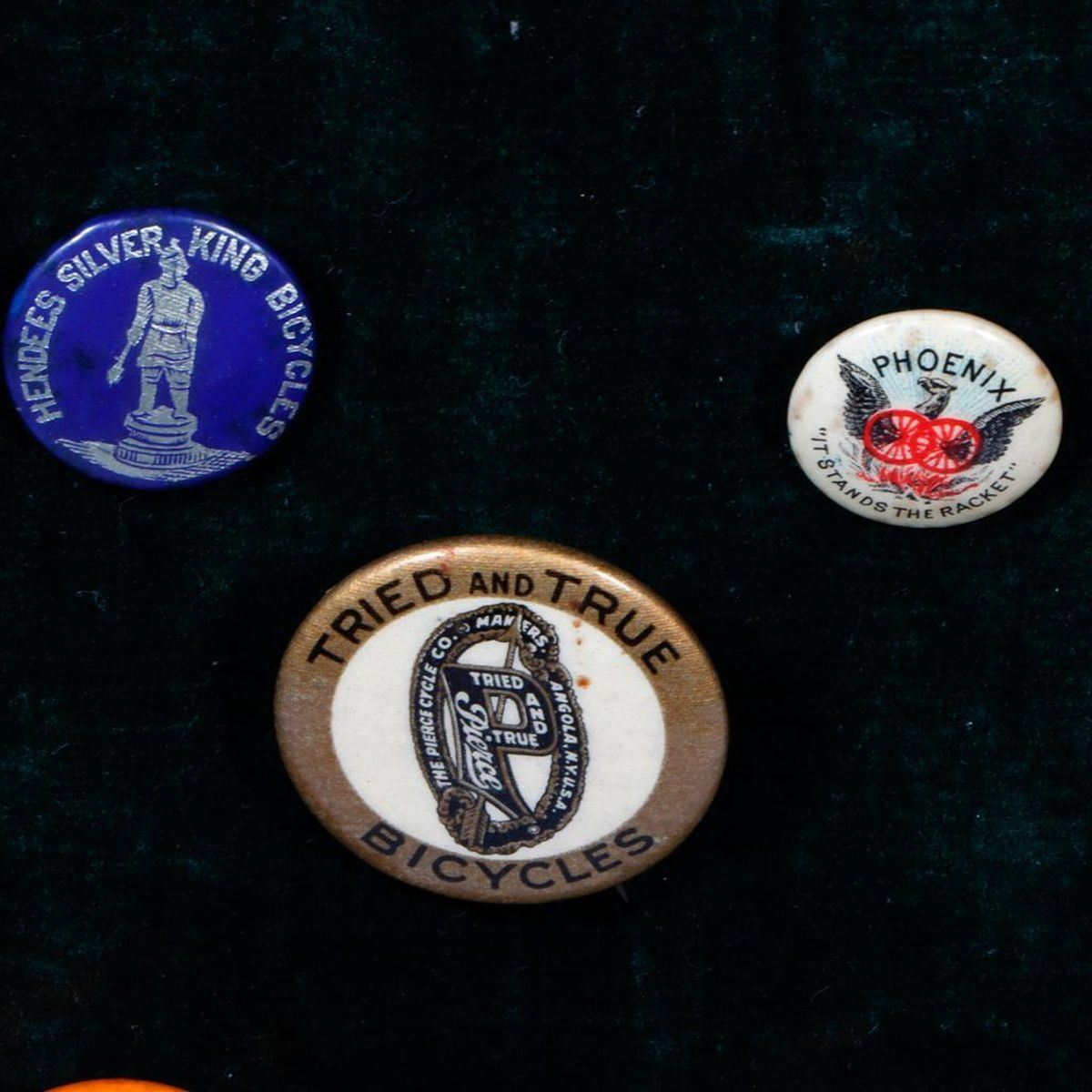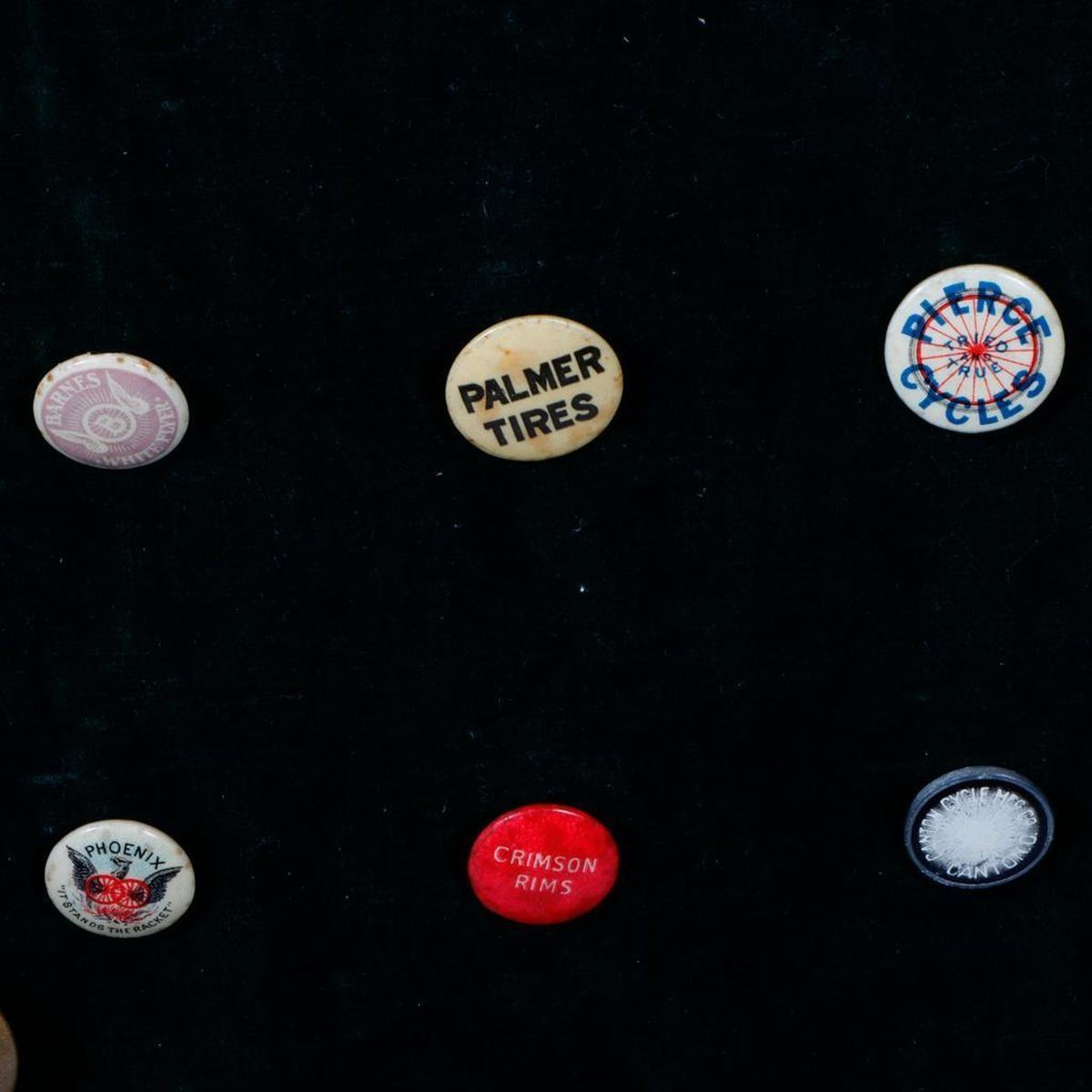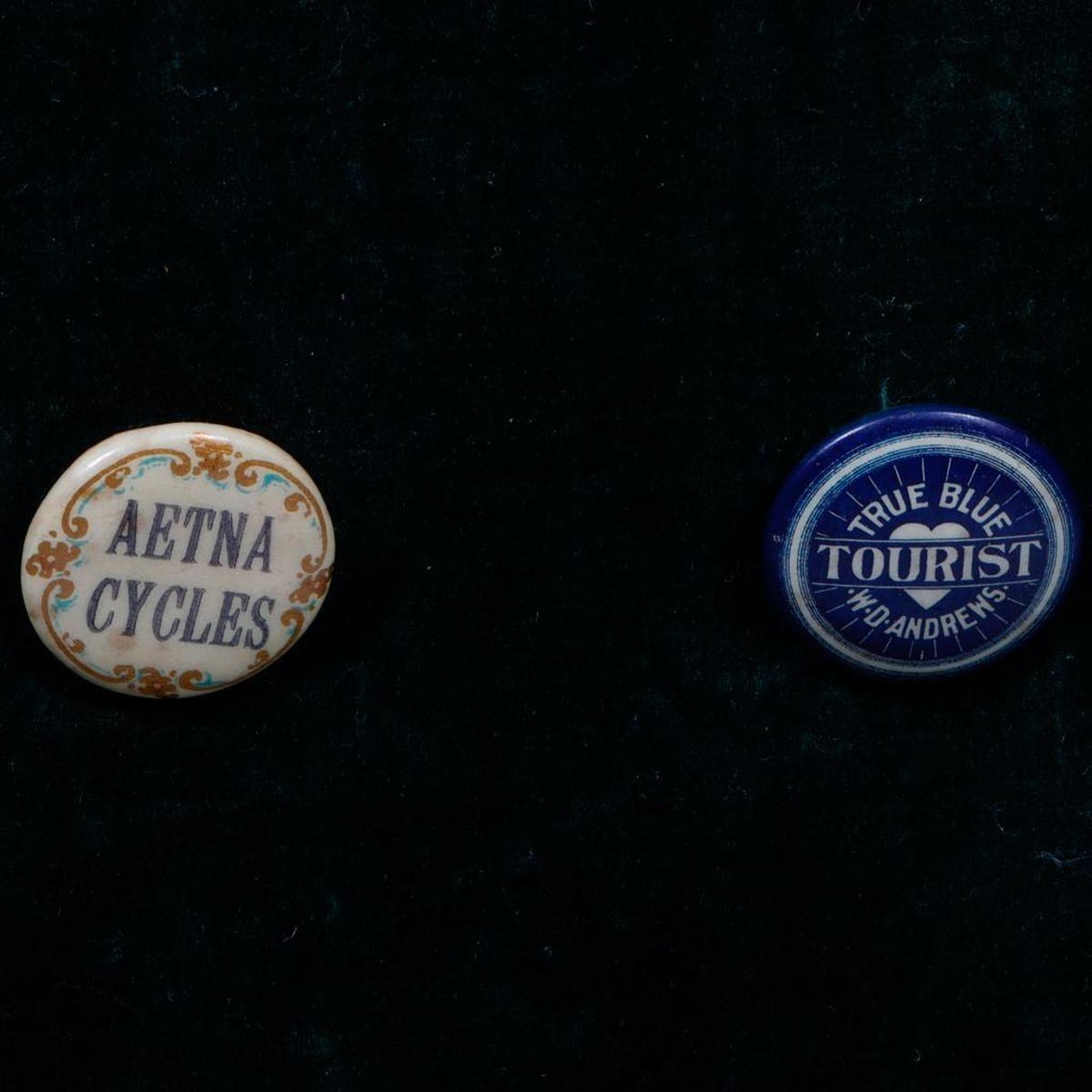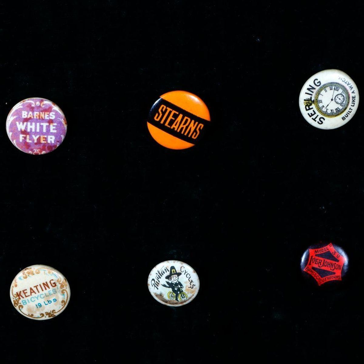 Bicycle club and promotional pins, consisting of 78 buttonhole rivet-backs, and four pinbacks. Brands include Victor, Super Ajax, Keating, Mars, Duquid, Shirk, Bellis, Aetna, Iver Johnson, Ben Hur, and others.
