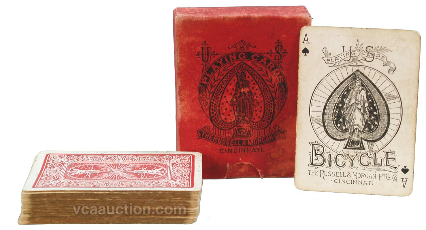 Early Bicycle Playing Cards - Arguably the most popular playing cards used in private card games for over 100 years, and still going strong. This early deck is complete with joker and slip case; Rider back design; second issue; deck shows wear; c1889 (Hochman code: US8).