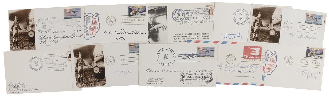 Ten commemorative covers and FDCs, each bearing cachets relating to aviation, or space exploration signed on the front in ink by various aviation pioneers. Signers are: Oliver C. LeBoutillier, Charles Hampson Grant, E. A. Goff, Paul Garber, Joseph Frantz, Al J. Engel, E. K. Jaqueth, Edward Korn, Russell Holderman, and Melvin Hodgdon. In fine condition with some mild toning to a few covers.