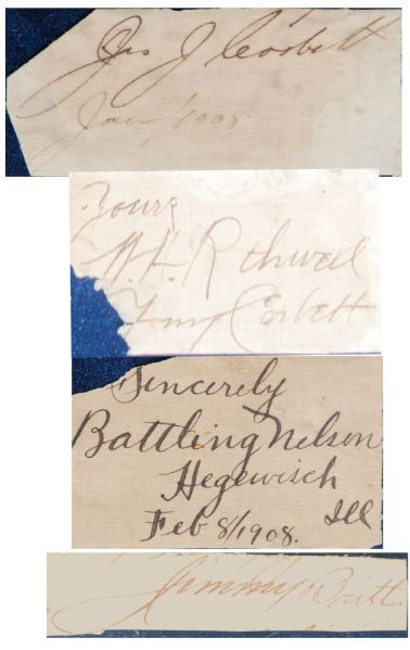 The autographs are in good condition, although some have been trimmed rather closely and irregulary cut. The Rothwell signature is missing a very small portion on the bottom of the w. and the beginning of the” Y” in Young. Please see photos on line for more detail. James John "Gentleman Jim" Corbett (September 1, 1866 – February 18, 1933) was an American professional boxer and a former World Heavyweight Champion, best known as the man who defeated the great John L. Sullivan. In 1854, his father, Patrick Corbett, had emigrated from Ballycusheen, Ballinrobe, County Mayo, Ireland to the US. Young Corbett II (born William J. Rothwell on October 4, 1880 Denver, Colorado and died on April 10, 1927) is a boxer who held the world featherweight championship. He was He took the name "Young Corbett II" in honor of James J. Corbett, a heavyweight champion Battling Nelson (Oscar Mathæus Nielsen) (June 5, 1882-February 7, 1954) was a Danish boxer who held the world lightweight championship on two separate occasions. He was nicknamed "the Durable Dane". Considered by some as one of the toughest boxers in history. Jimmy Britt (October 5, 1879, in San Francisco, California – January 21, 1940) was a boxer from 1902 to 1909. He fought Joe Gans twice for the World lightweight title but lost both bouts.