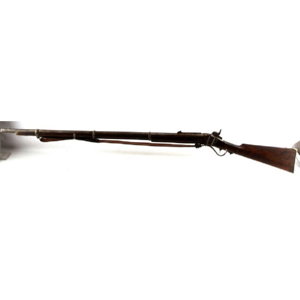Wood stocks, 40" round barrel, 6 grooved good clear bore, fixed front & ladder rear sight. Markings on top of barrel "5 36" & "Cyc". Unknown maker. Steel has mottled but smooth patina, case hardened to receiver. Replaced leather sling is attached. Brass butt & fitting to fore stock. Minor dings & wear. Overall good condition. Serial #: 536 9828-030818-LA-06189