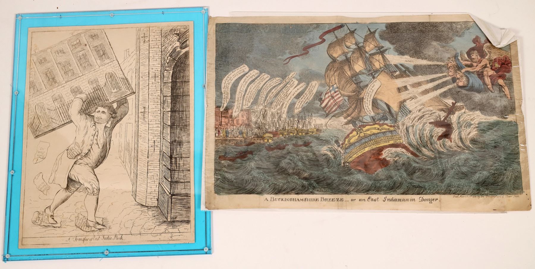 A pair of illustrated cartoons commenting on the state of British trade issues in the year following the War of 1812. The first piece is on paper and measures 17"x 11" and is titled "A Buckinghamshire Breeze or An east Indianman in Danger." The second piece is a pencil or ink cartoon, measuring 14"x 11" and mounted in plastic. It's titled "A Transfer of East India Stock."