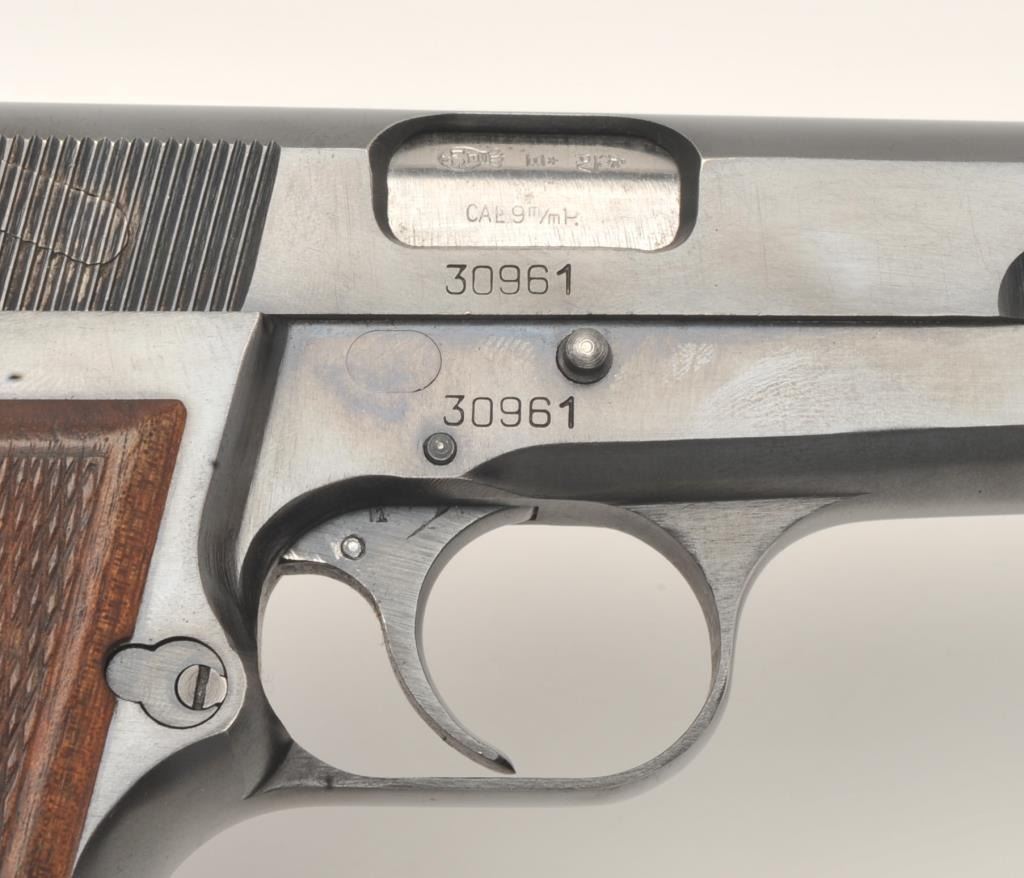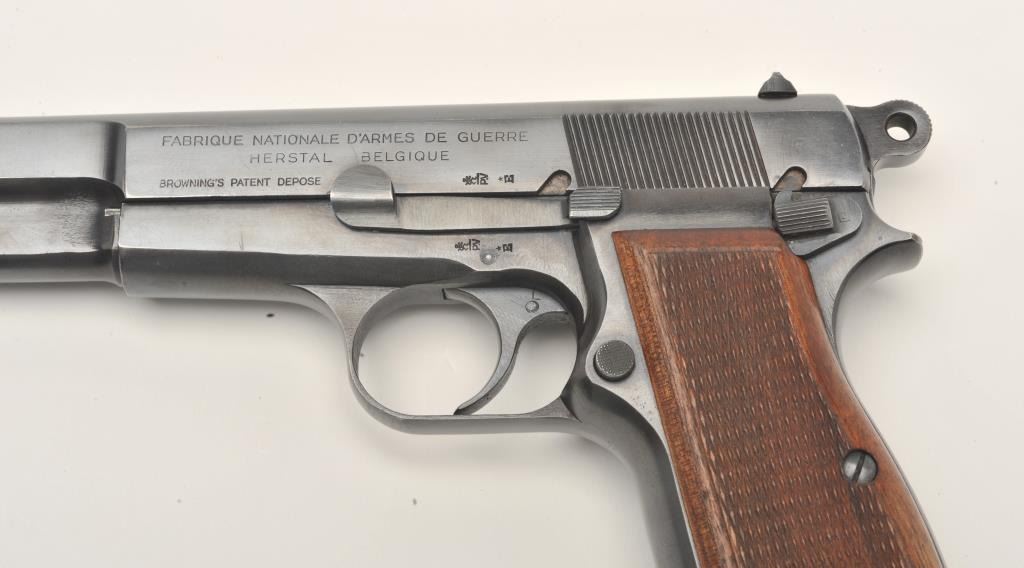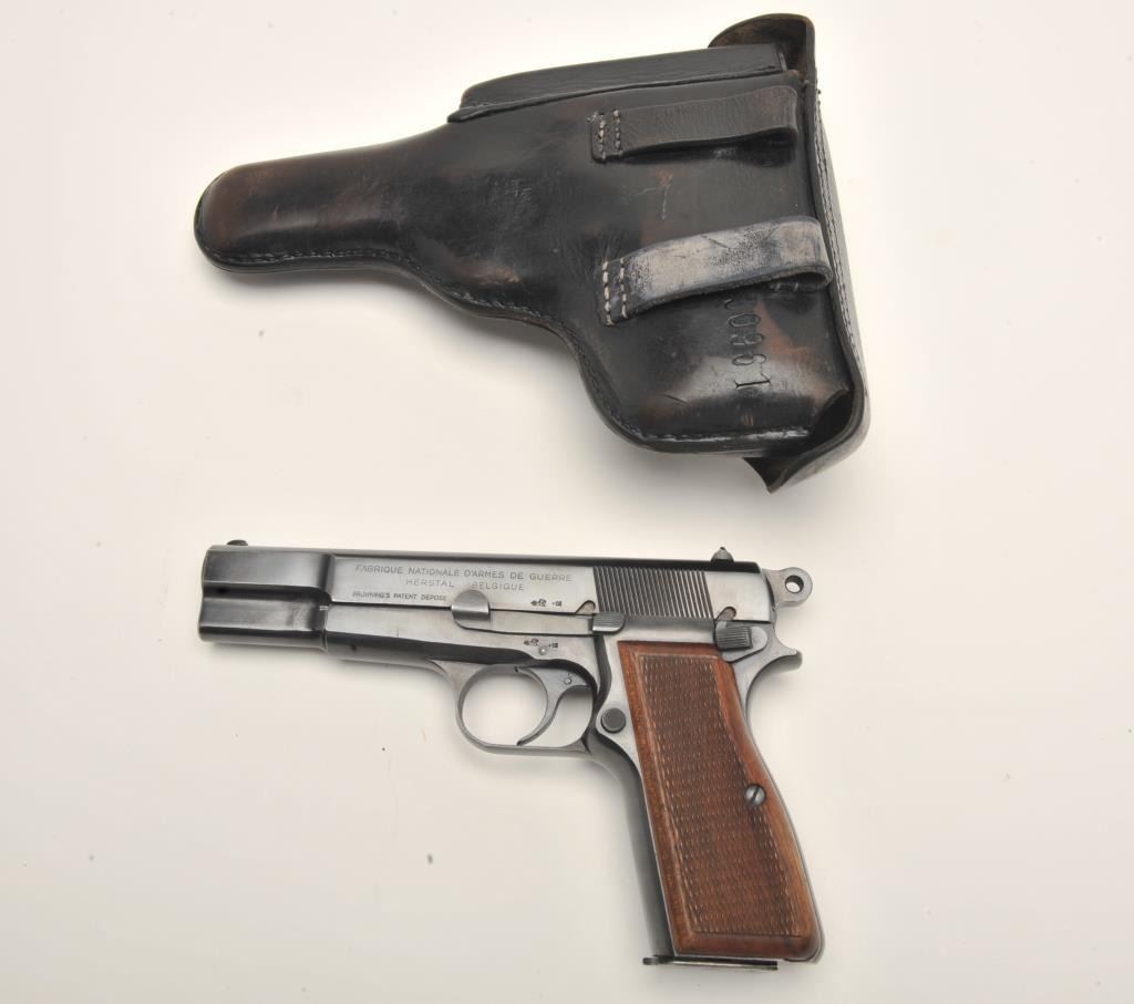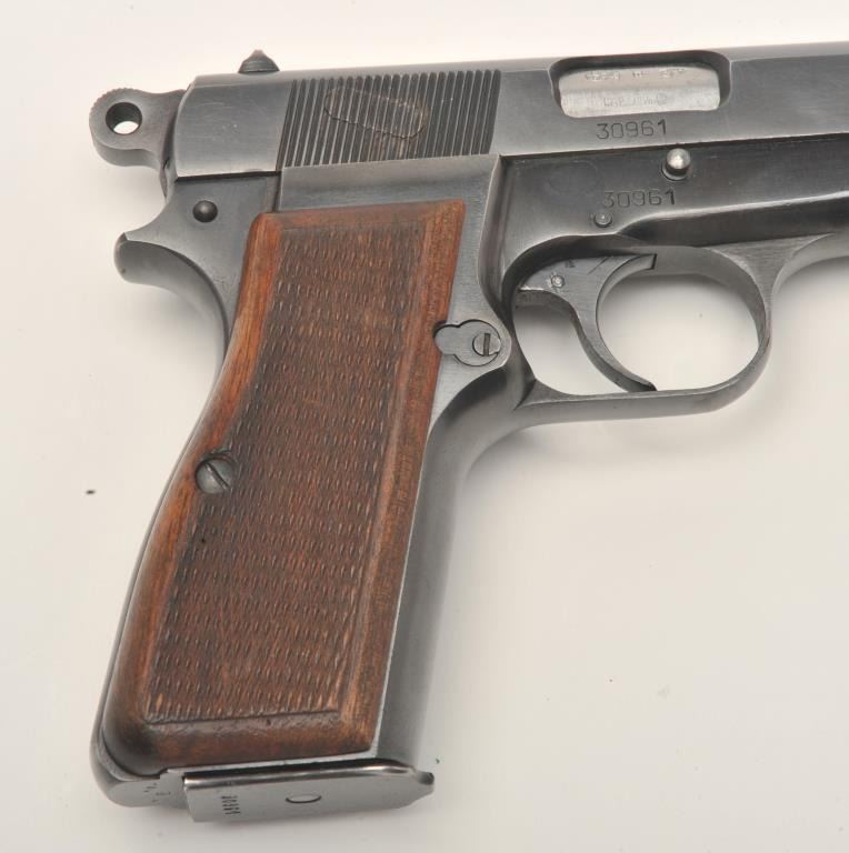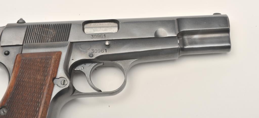 Early Browning High Power semi-automatic pistol, 9mm caliber, 4.5” barrel, blued finish, checkered wood grips, S/N 30961, with two matching magazines and Belgian military leather flap holster; this gun is in overallfine condition showing the majority of its finish, fine bore, action, markings and grips; CONSECUTIVELY NUMBERED TO THE PREVIOUS LOT (S/N 30962). (C&R/NoPPT/NO MAG. DELIVERABLE TO CALIF. RESIDENT). Est.:$1,000-$2,000.