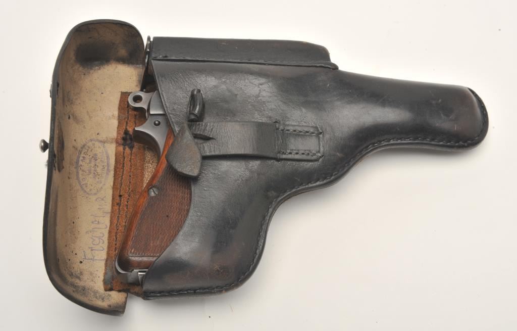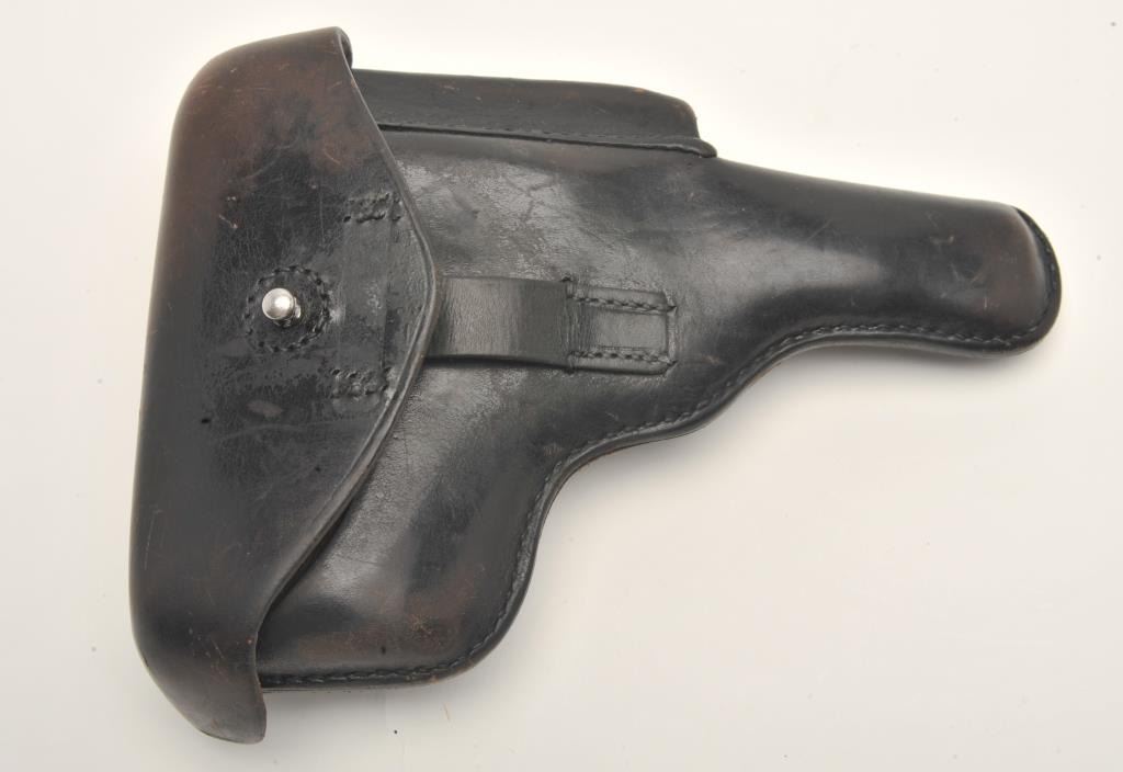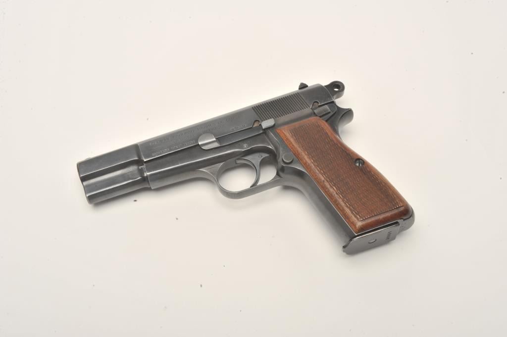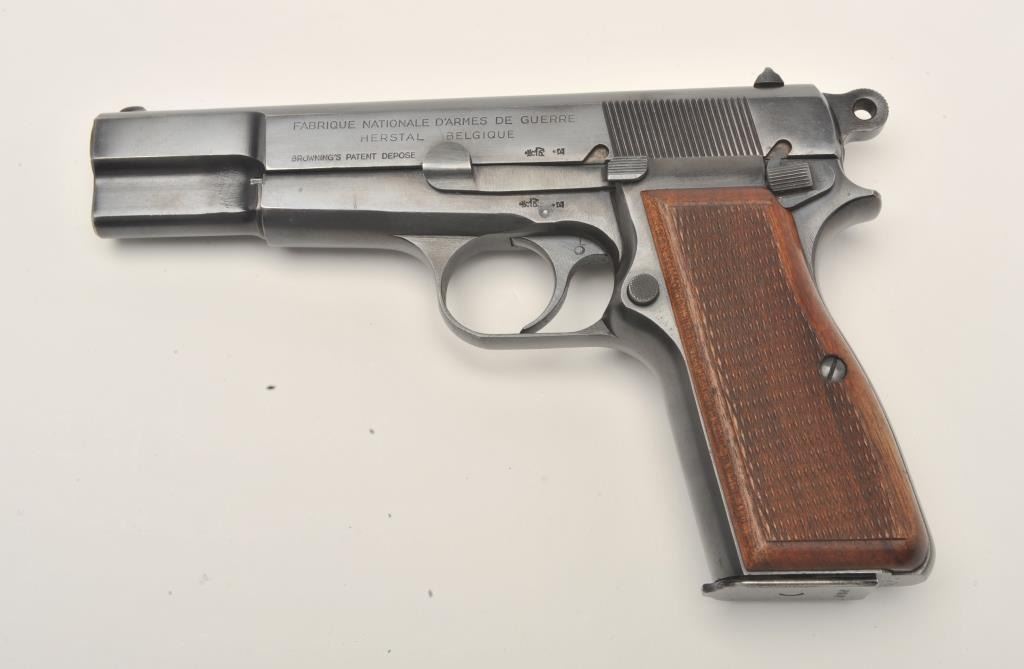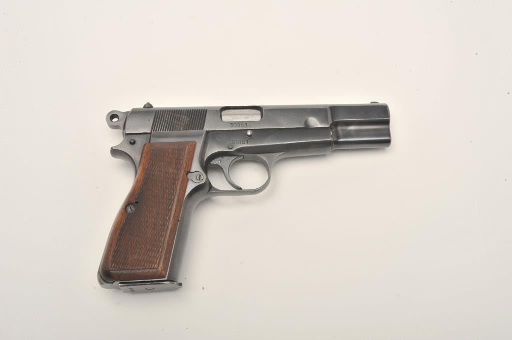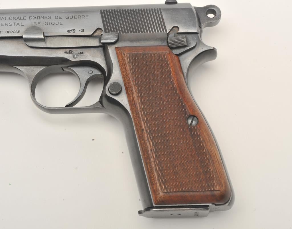 Early Browning High Power semi-automatic pistol, 9mm caliber, 4.5” barrel, blued finish, checkered wood grips, S/N 30961, with two matching magazines and Belgian military leather flap holster; this gun is in overallfine condition showing the majority of its finish, fine bore, action, markings and grips; CONSECUTIVELY NUMBERED TO THE PREVIOUS LOT (S/N 30962). (C&R/NoPPT/NO MAG. DELIVERABLE TO CALIF. RESIDENT). Est.:$1,000-$2,000.