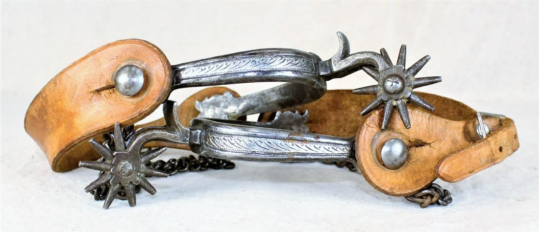 Crisp pair of single inlaid spurs with radical drop shanks finely engraved silver and nice original straps.