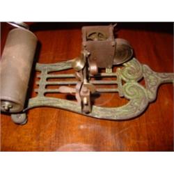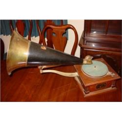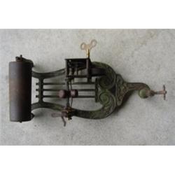 Early Cylinder Roll Phonograph with cast metal lyre-shaped base (vestiges of green paint can be seen); stamped with manufacturers' name but it is indecipherable. Missing playing arm. Comes with blue and gold morning glory horn and winding key. 11.5" long, 4" tall to top of cylinder holder, 5.75" wide. Horn is 13.75" long and 10.25" in diameter.