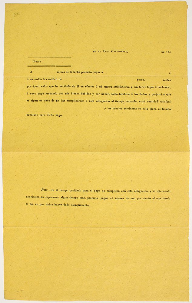 c1840 Choice early promissory note in Spanish for money loaned. The document is datelined "Alta California." The blank space next to Alta California could have been filled in with the town, such as Montery. Full translation is included with the lot. This rare piece is one of the earliest printed California financial documents, and was undoubtedly printed in California, making it one of the earliest to have been printed in California, sinceit is pre-Gold Rush. From the Ford collection. - HKA#66121