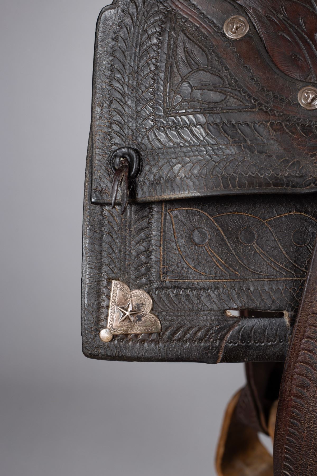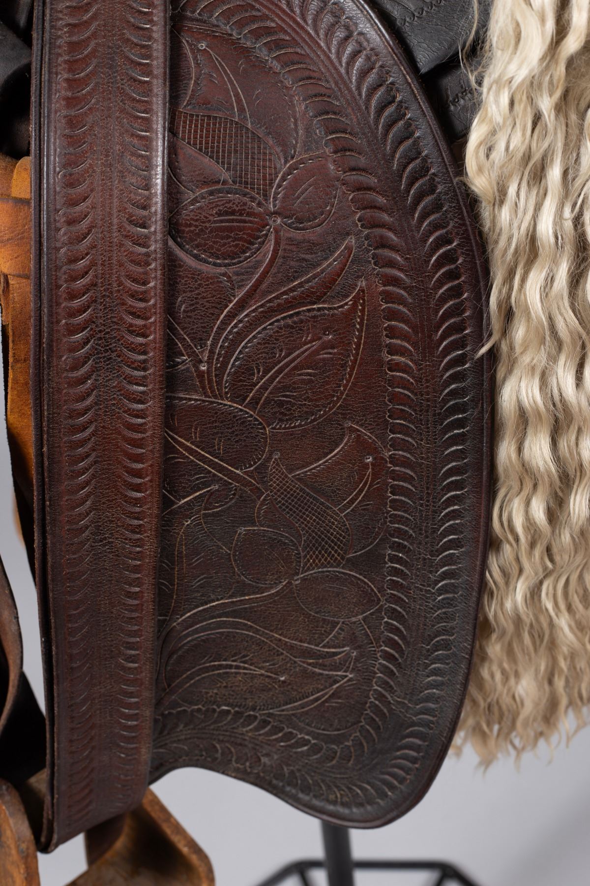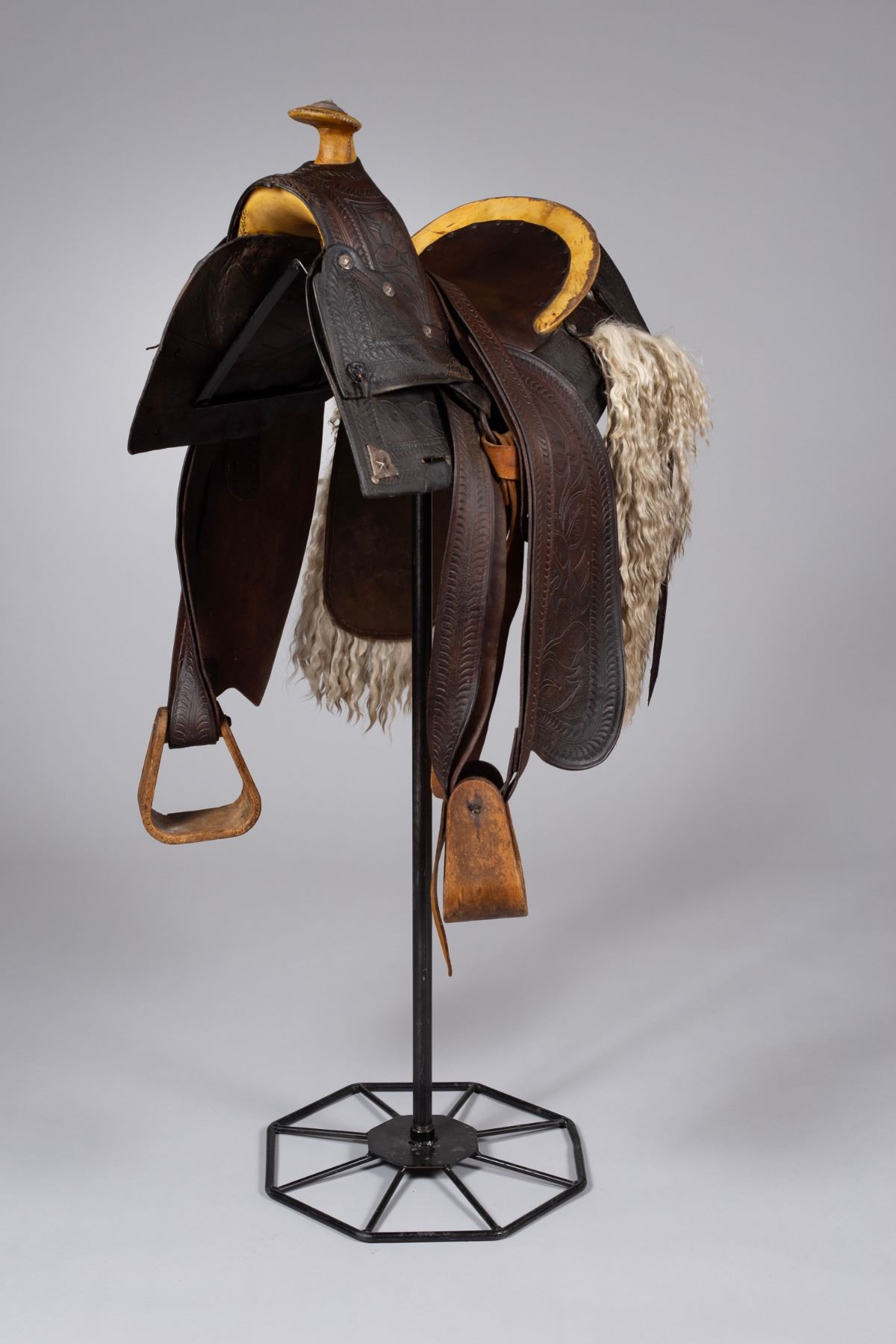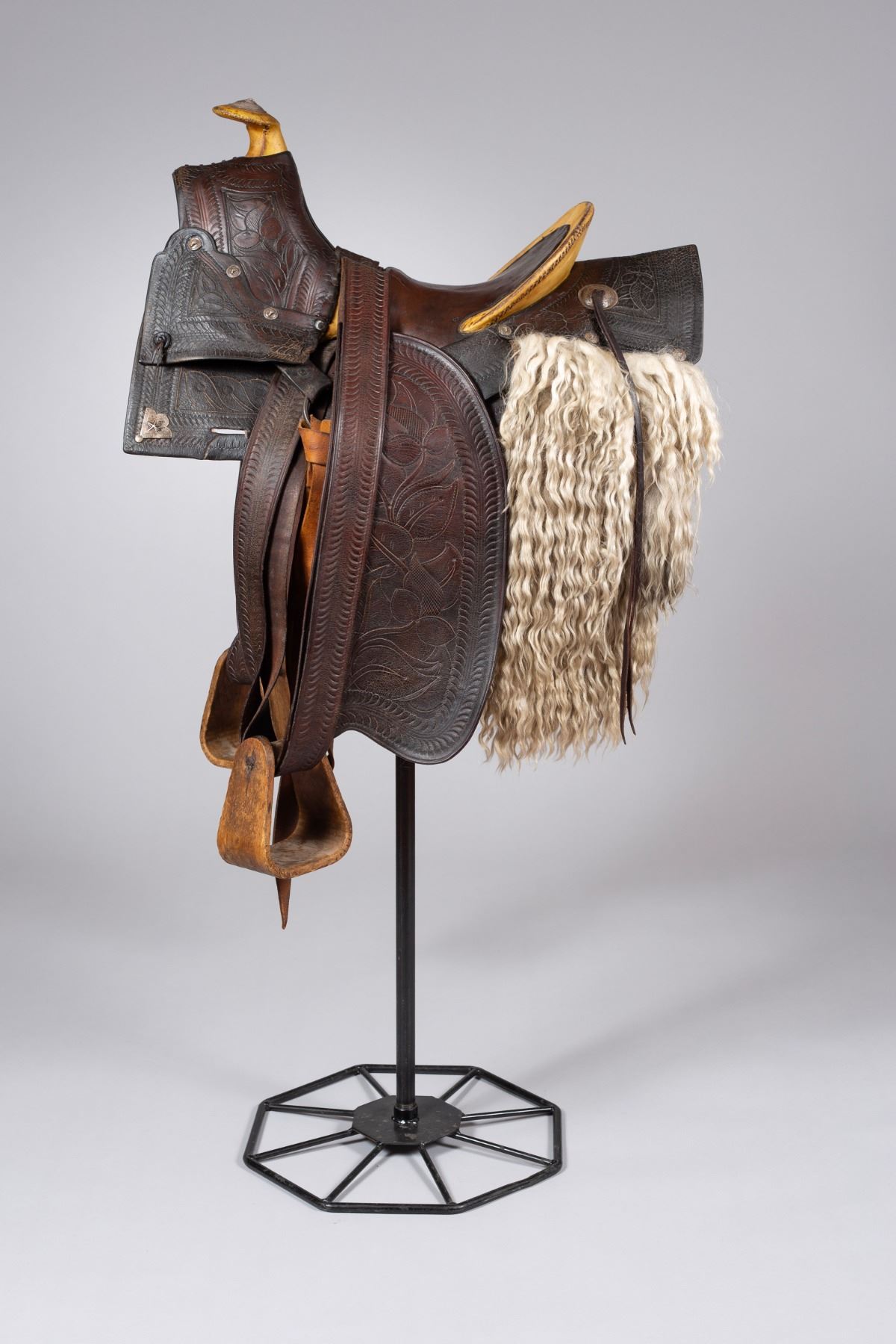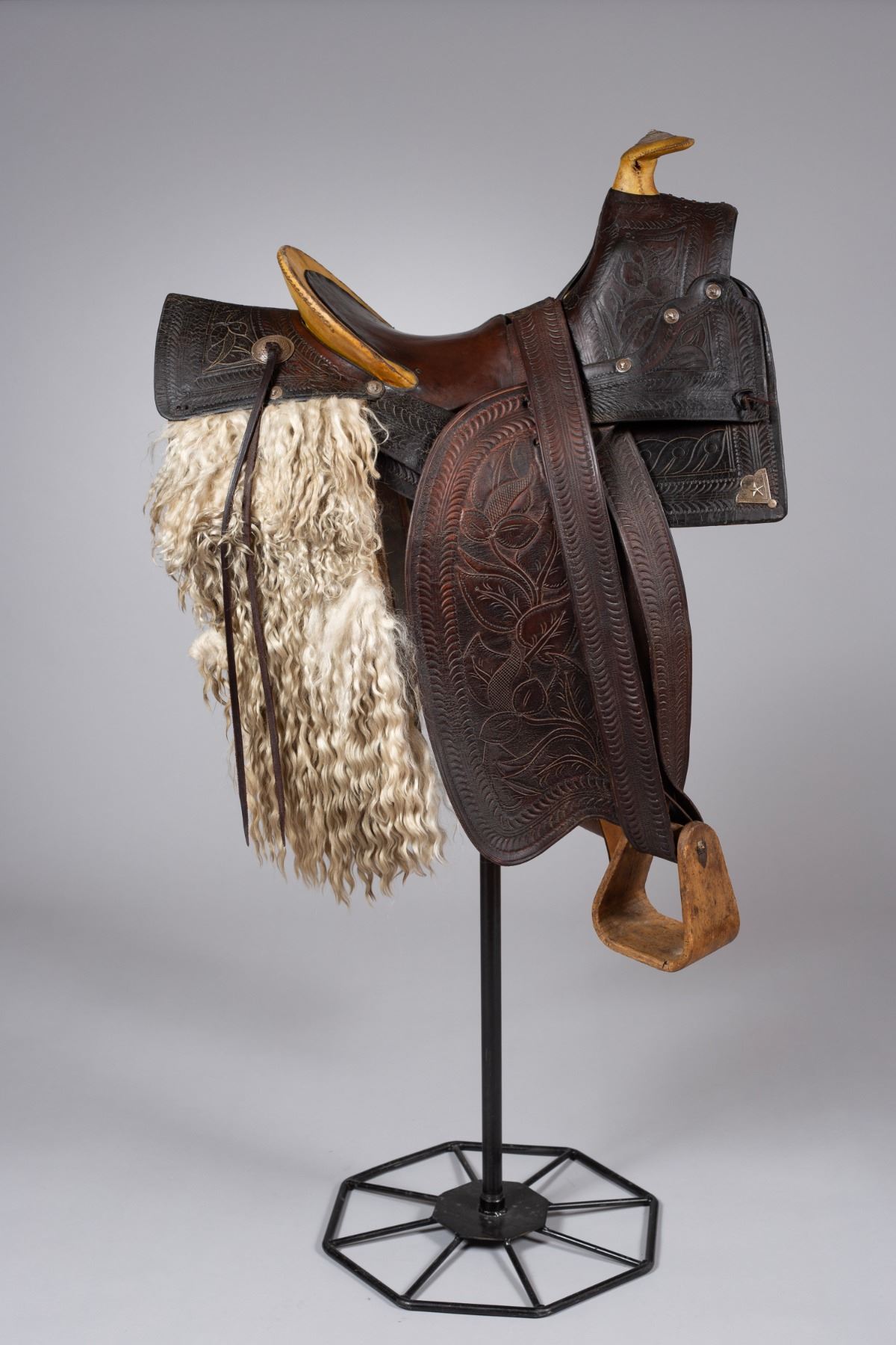 A stunning example of early California saddle-making, featuring a high horn and detailed tooling typical of the region's style. The saddle boasts a distinct and well-preserved angora skirt, a rare and highly desirable feature. The leather is nicely tooled with traditional patterns that reflect the aesthetic of the San Francisco saddle shops. Adorned with silver steerhead conchos, including a prominent, large steerhead concho on the horn, adding a touch of elegance and status.
