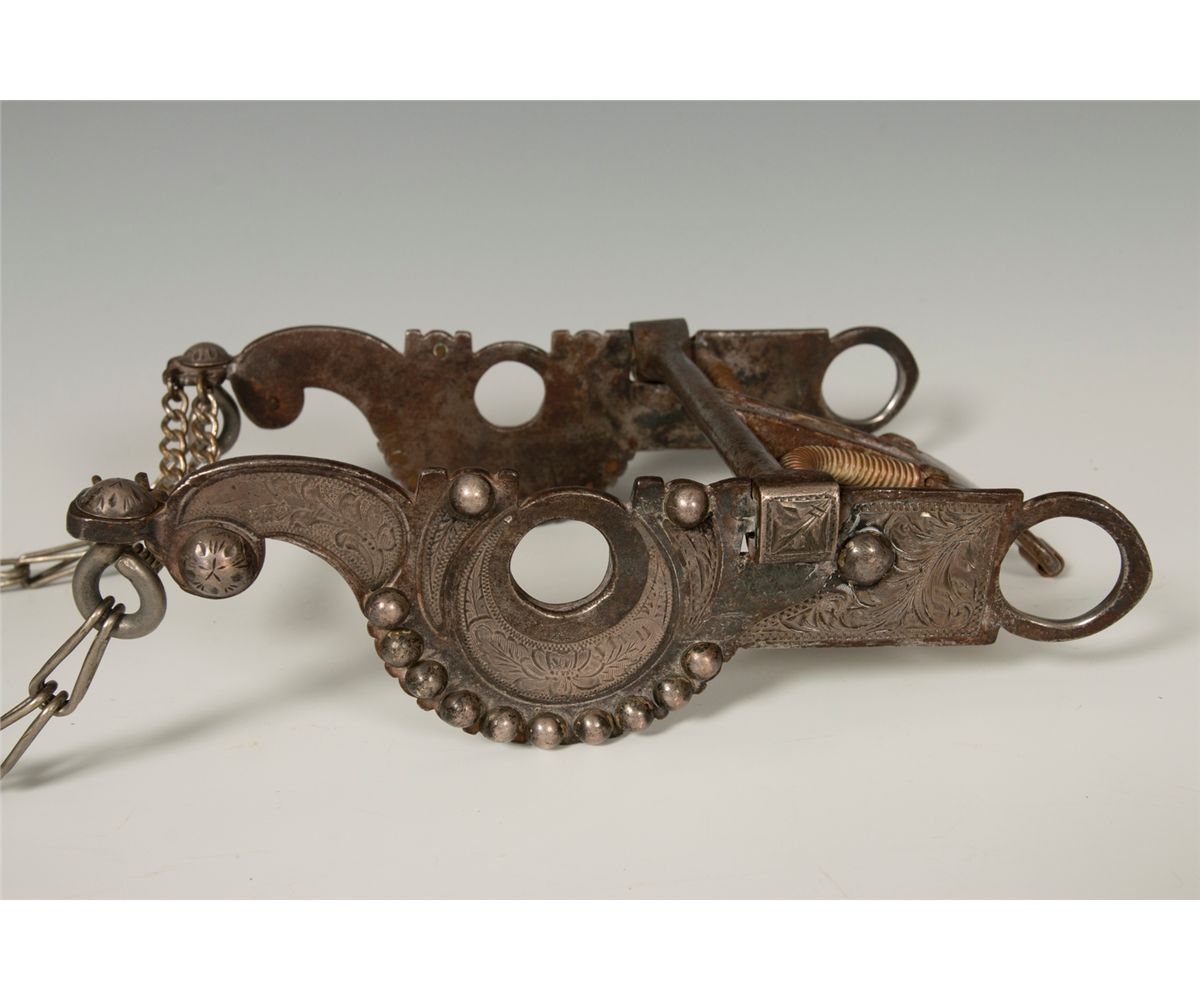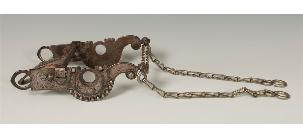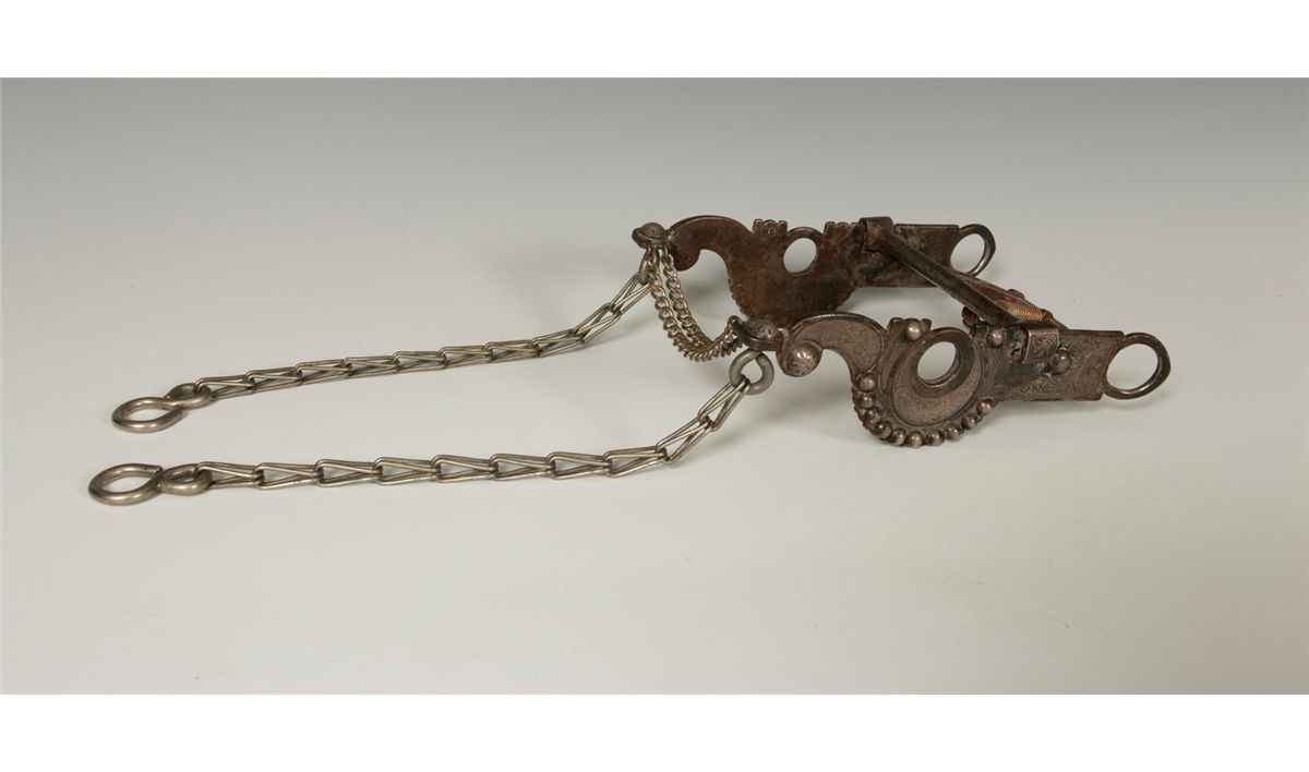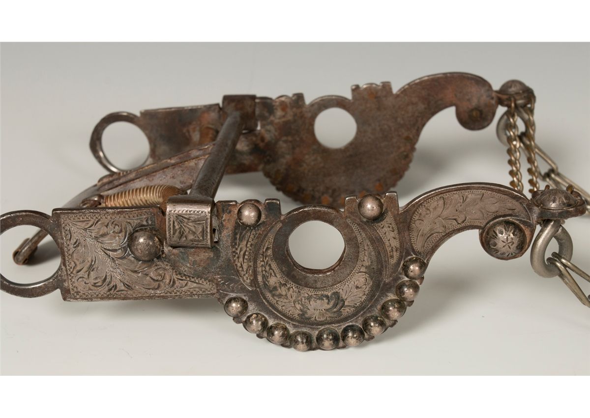 Early California Spade Bit. 8" long. Silver inlaid and highly engraved. With rein chains. Circa 1920s. Provenance: Golden Eagle Trading Co.