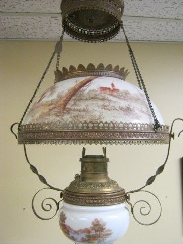 Early Canadian milk glass hanging lamp, with hand painted scenes.