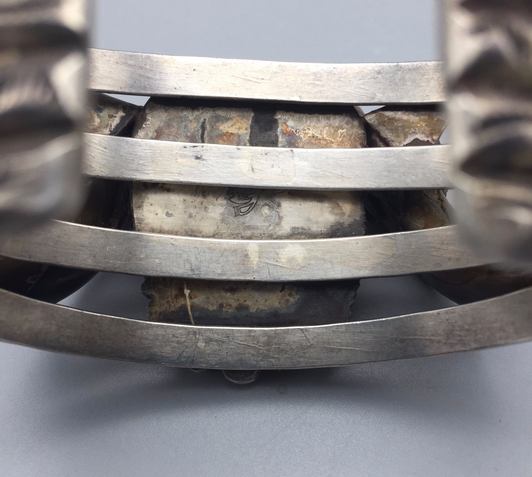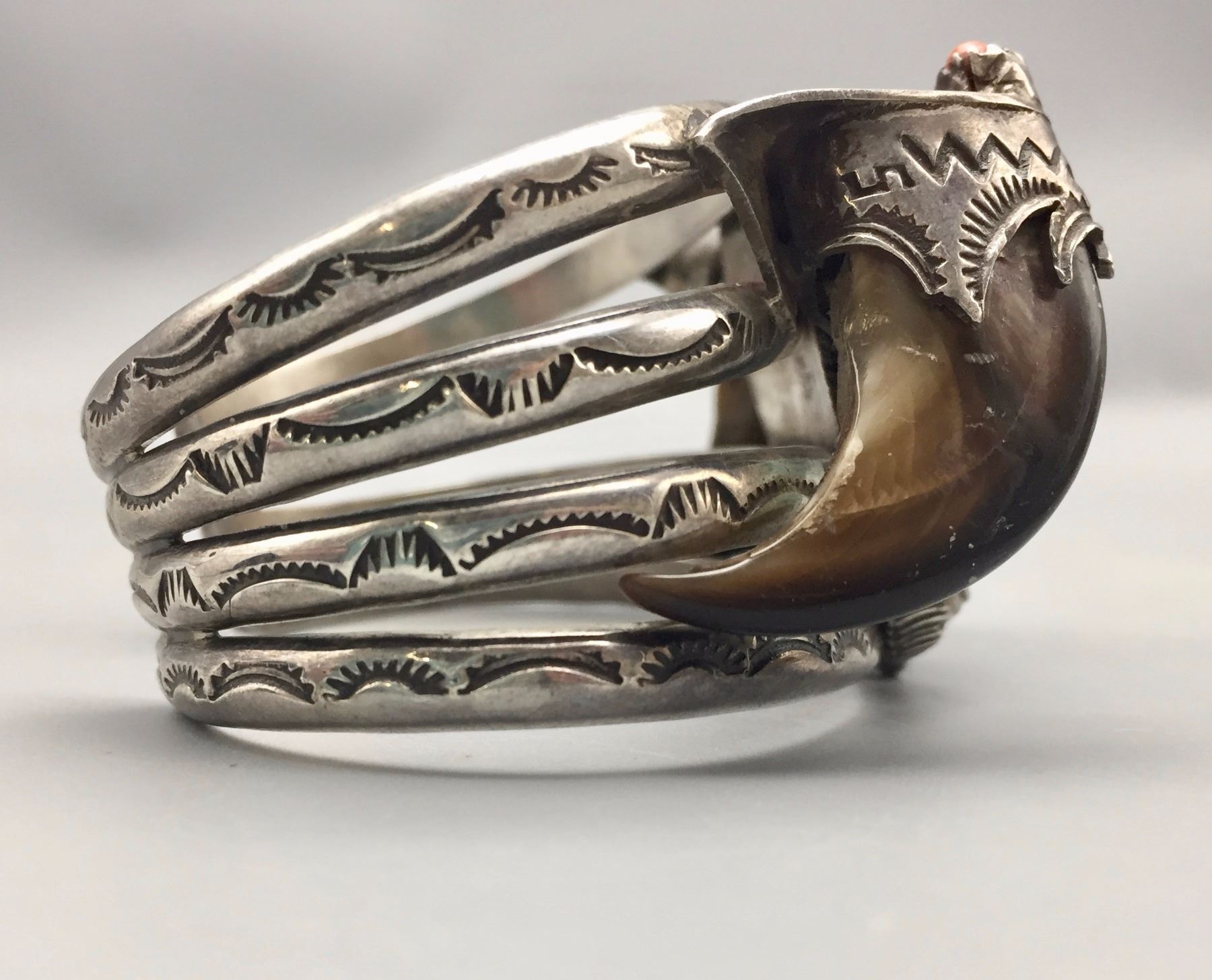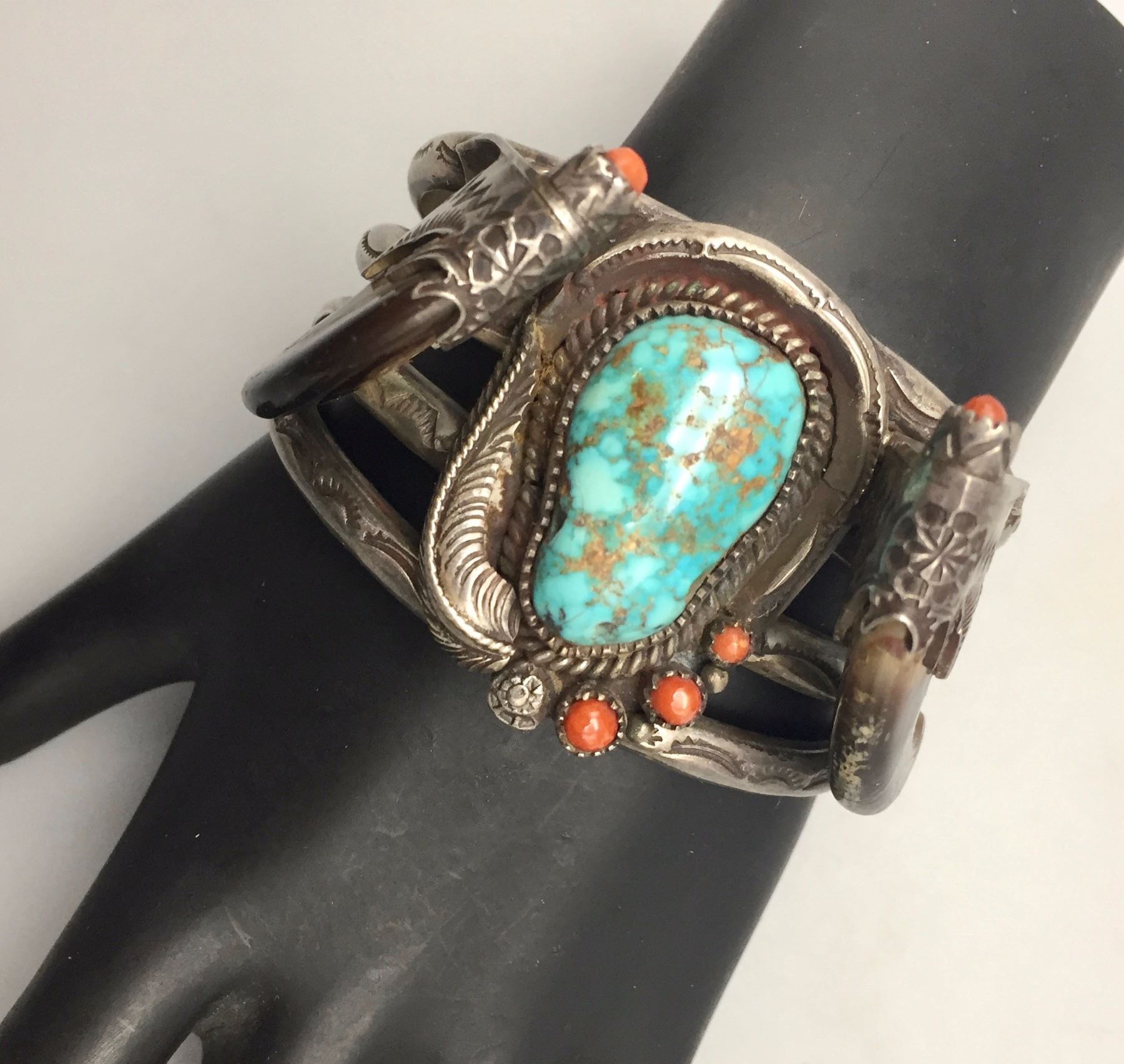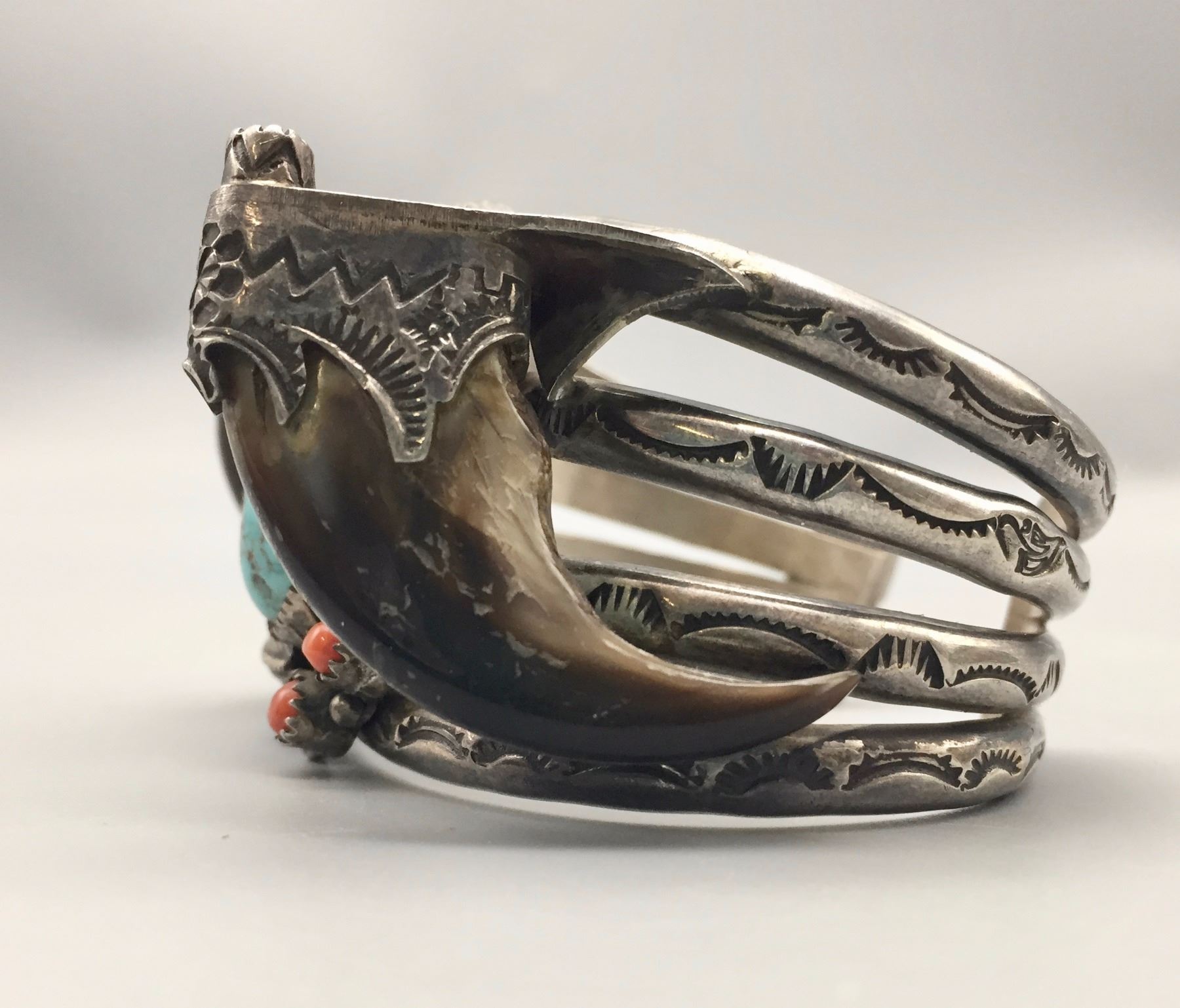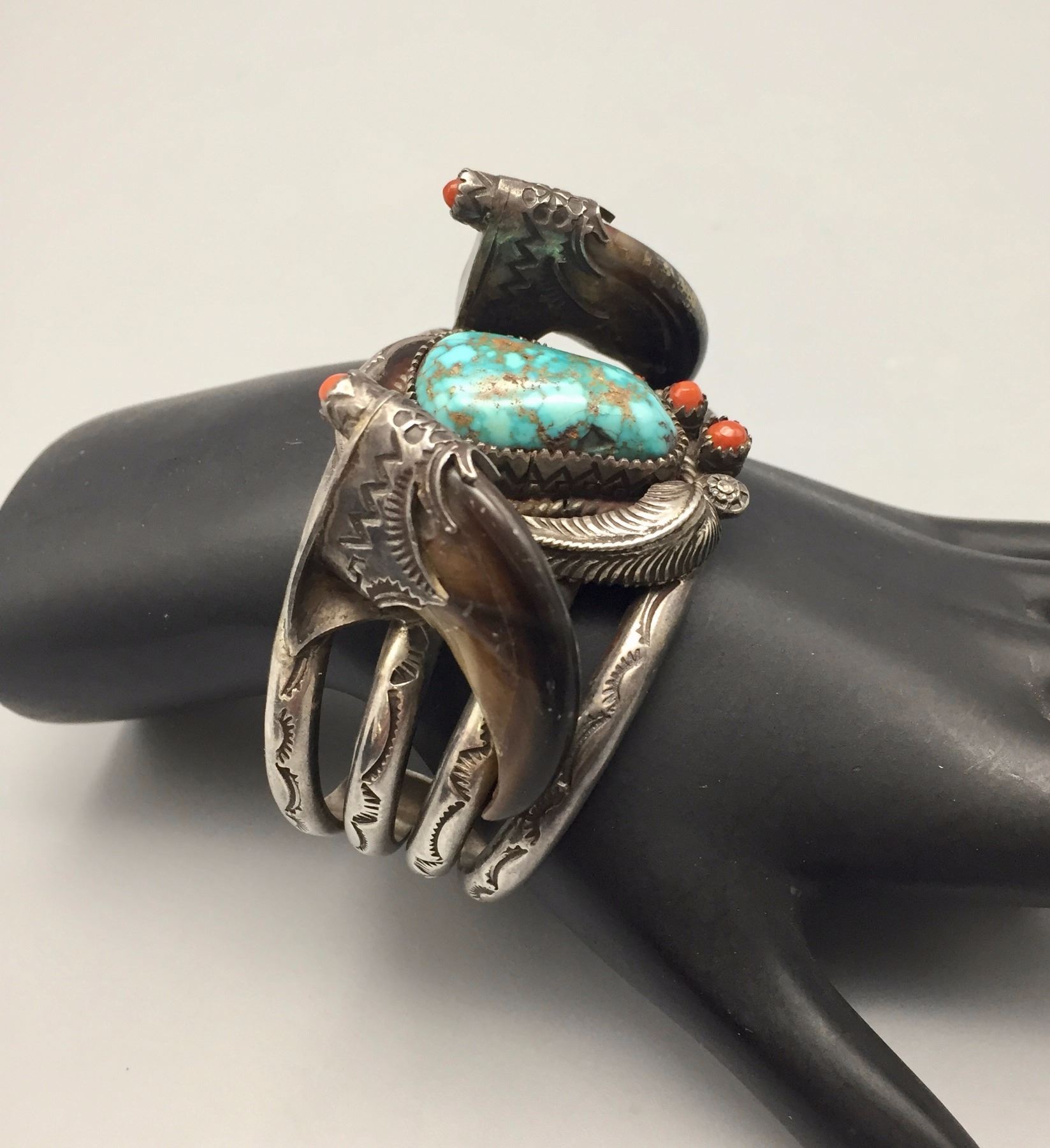 Maker: Carl and Irene Clark, Navajo. It is signed. Approx. Age: Vintage., circa early 1970s. Size: Inside circumference measure 5 3/4” with a 3/4” opening and is 1 5/8” at its widest point. Weighs 106.1 g. Additional Info: This is a very nice, early example of Carl and Irene’s work. They are now famous for their micro-inlay. This bracelet has very nice turquoise with two bear claws set in embellished sterling silver. Condition: Good. Normal wear expected. Please look closely at the pictures - they are an important part of our description. Shipping: There will be a $5 handling / packaging fee for shipping this lot. The actual cost of postage will be added on top of that.