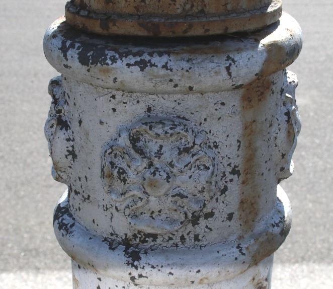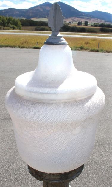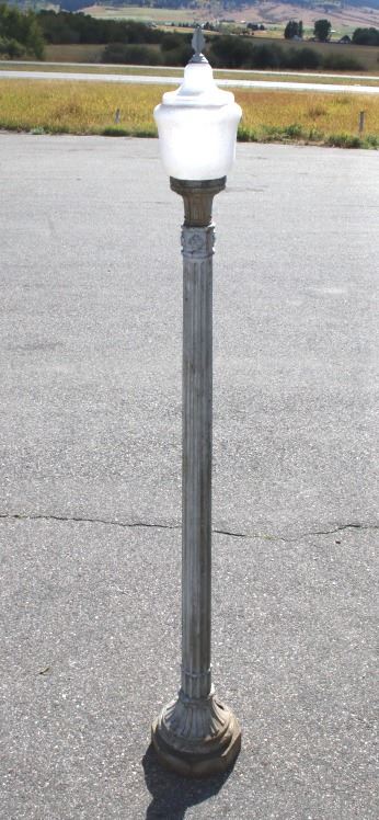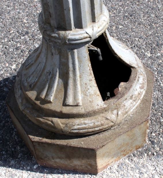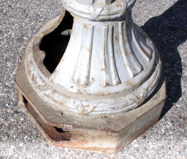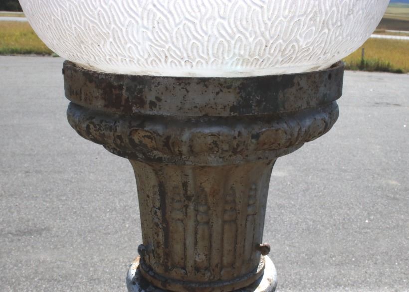 The lot features an early rare original cast iron electric street lamp with globe originating from circa 1900’s. The lamp is wired for an electric light but has not been tested. The lamp post shows a large pillar style construction with octagonal base having a wonderful round adorned foot. Overall the piece shows a fine Art Nouveau style with floral cast motifs, pillars, and a flowing top. The globe is covered in small groves giving the appearance of flames and is blow with a fantastic curved two-tier design having the original iron finial atop the entire piece. It is very uncommon to see a complete original piece such as this even retaining some of the original paint. The piece could have originally been an Arc Lamp as was common in the early days of Street Lights. The piece is from a large Minnesota collection and is thought to have originated from a prominent Western City in the United States possibly San Francisco, recovered post-earthquake. Tt measures 141" tall by 19" at the widest on the base.