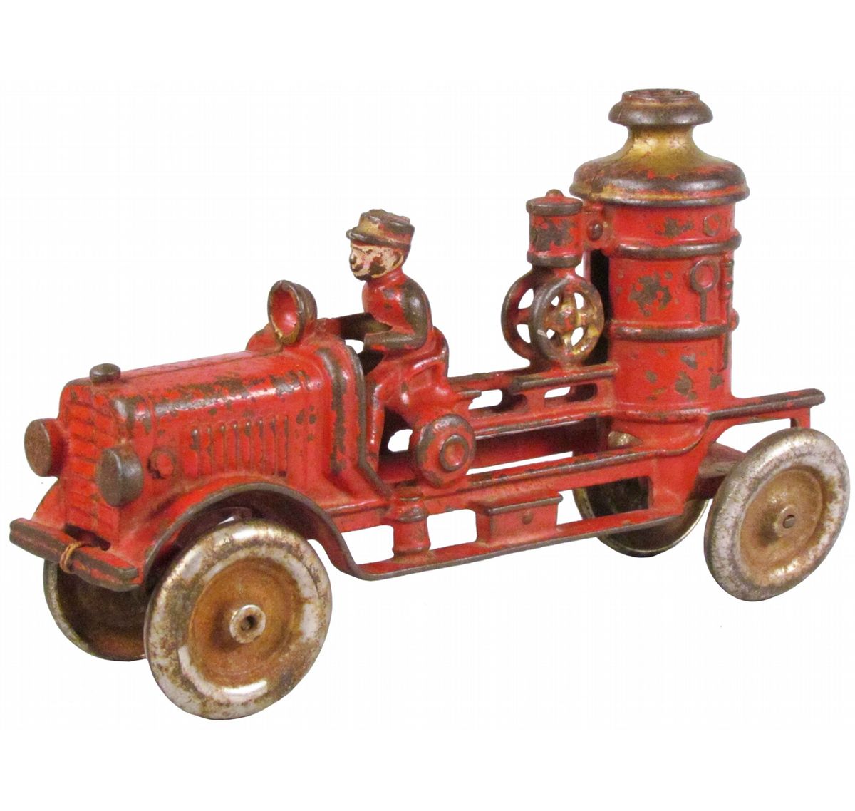 Early Cast Iron Toy Fire Steamer with attached driver. Most original paint intact, good condition. 8 inches long.