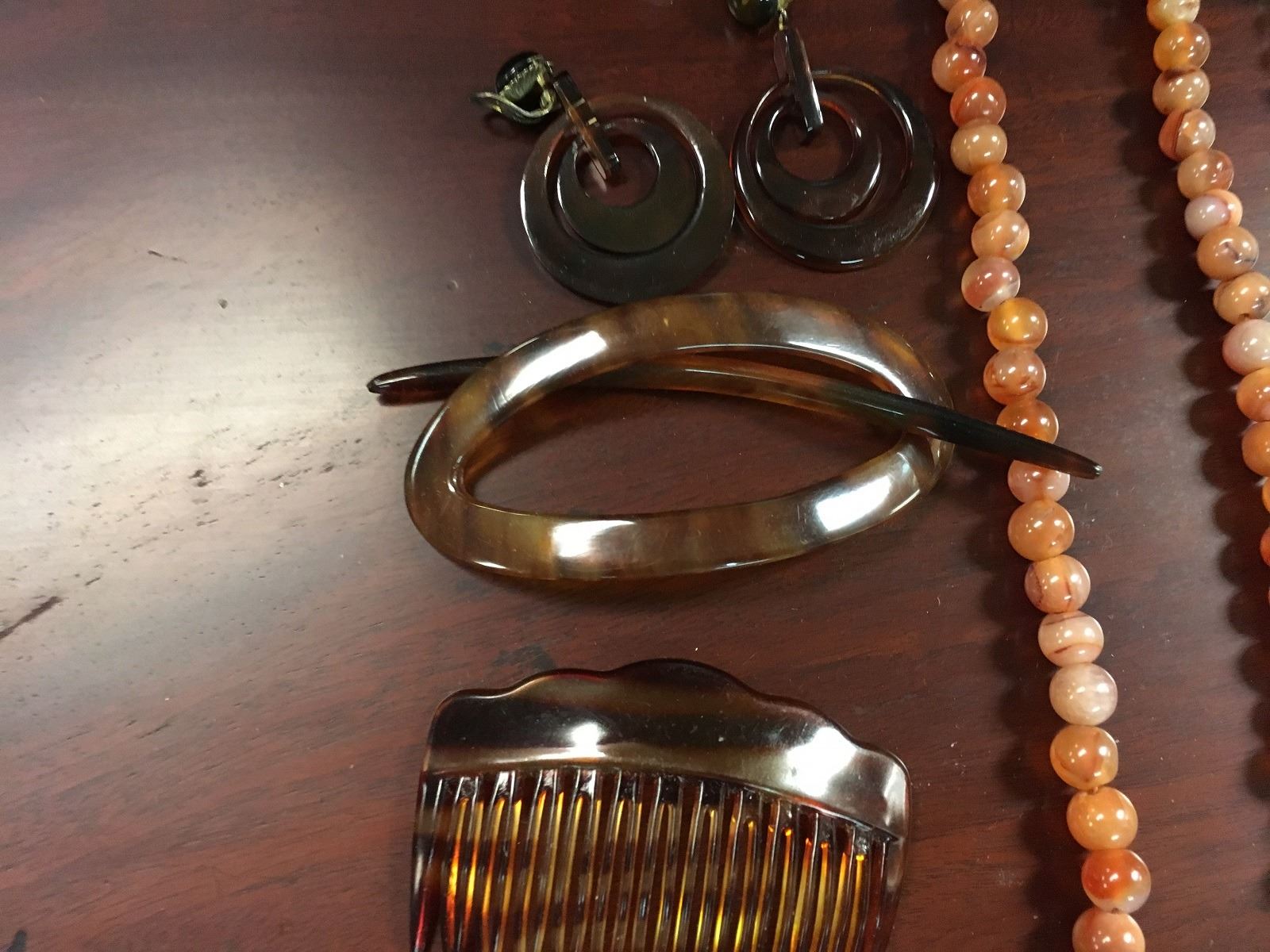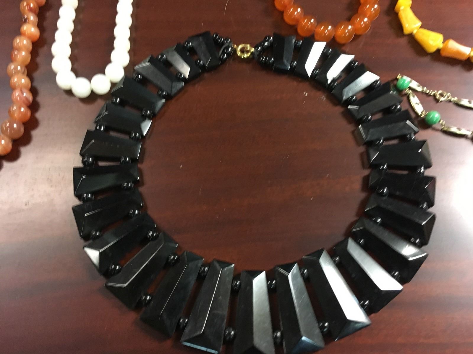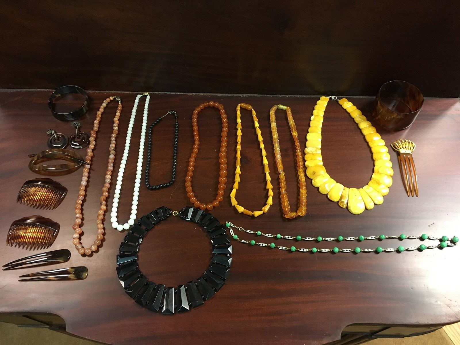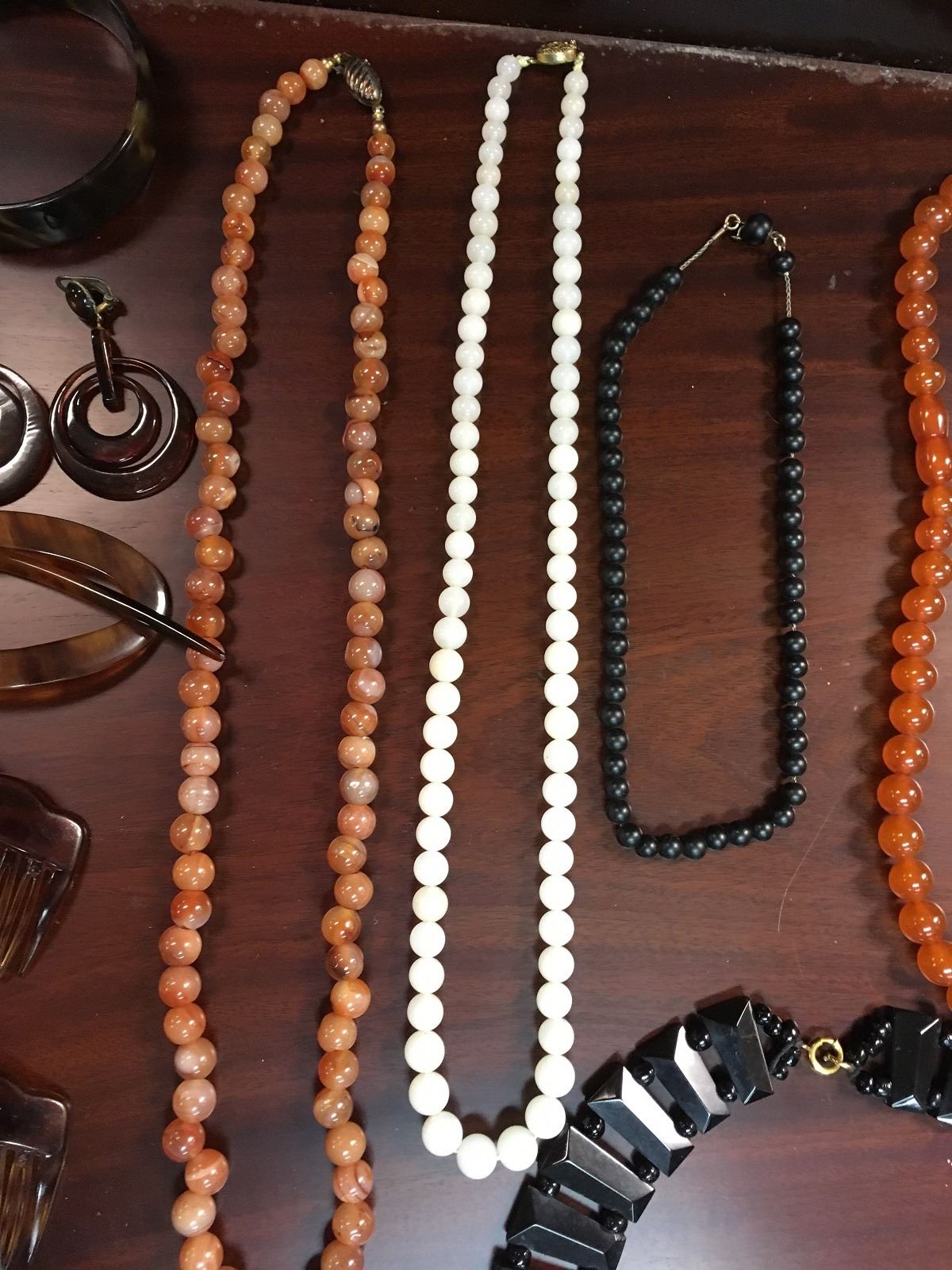 Early Celluloid and stone necklaces, bracelets, hair pins, and earrings.