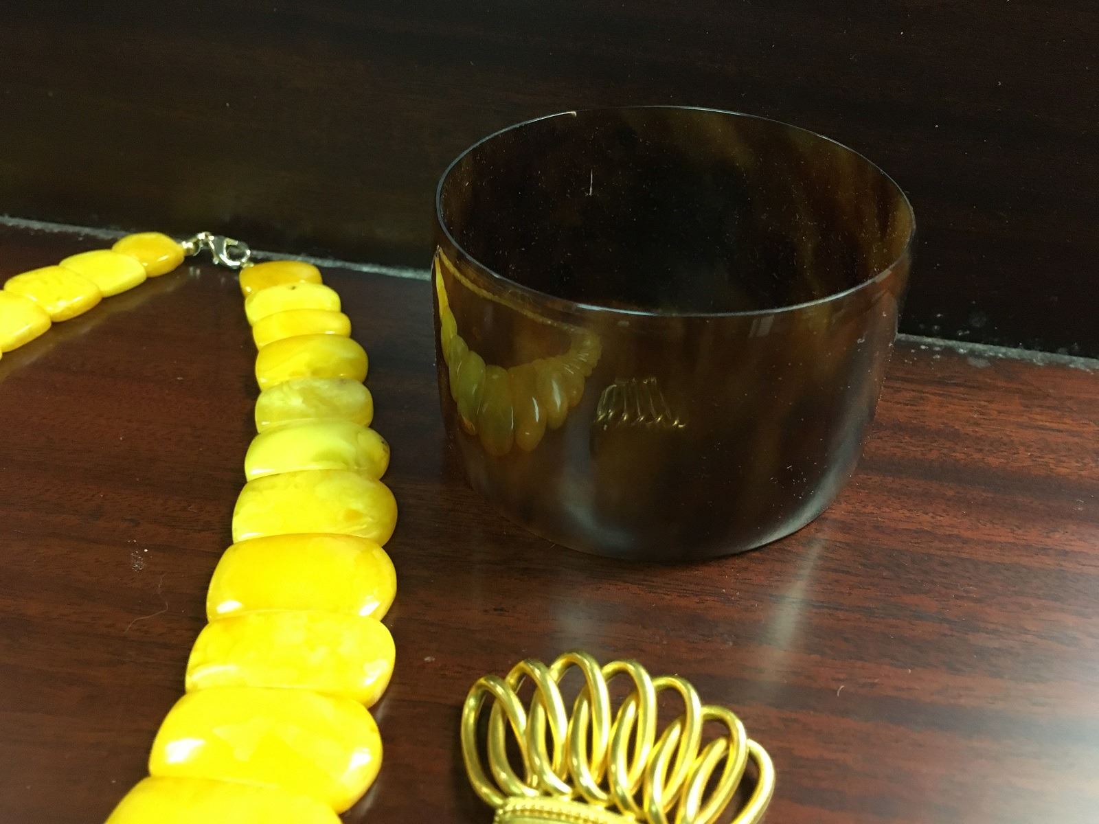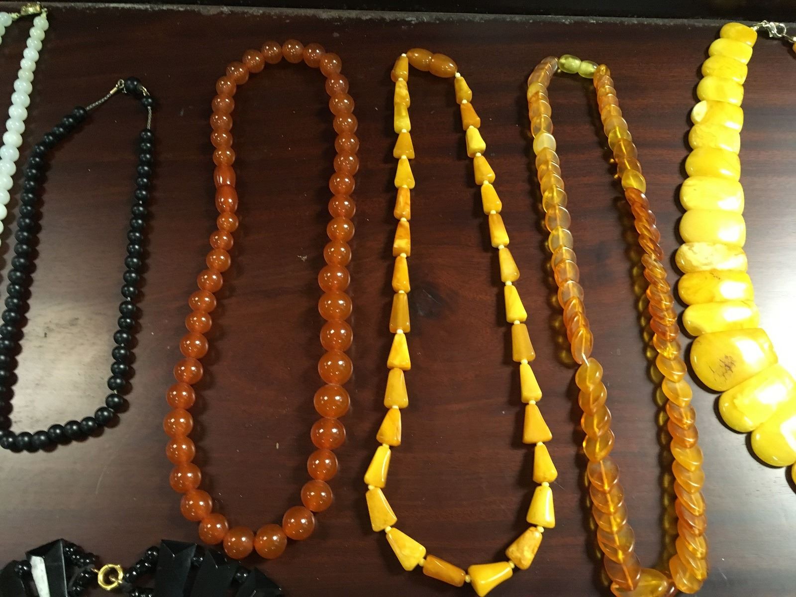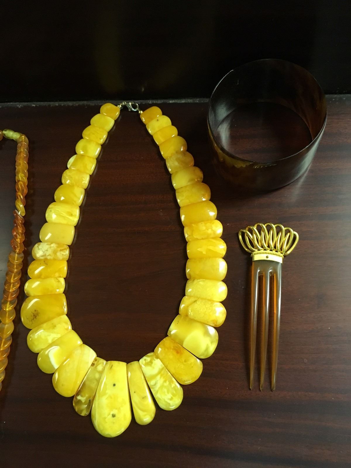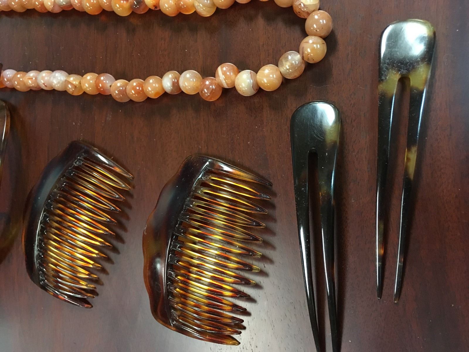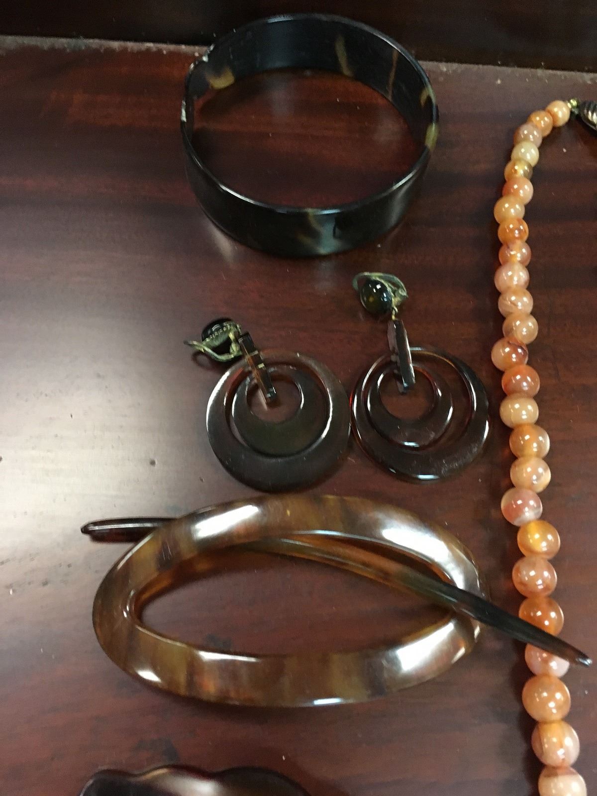 Early Celluloid and stone necklaces, bracelets, hair pins, and earrings.