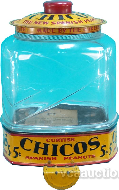 Early Chicos Spanish Peanuts Glass Jar w/ tin lid and tin wallmount