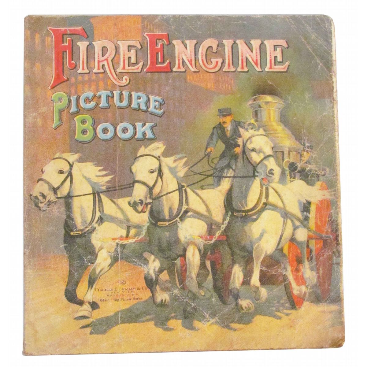 Early Childs Linen Picture Book with Fire Motif. Excellent color and graphics. 6 pages including cover, 6 images in full color and 6 in black and white. Charles Graham & Co. NY made in USA, Big Picture Series. Very good condition. 10 1/4 X 11 inches.