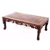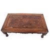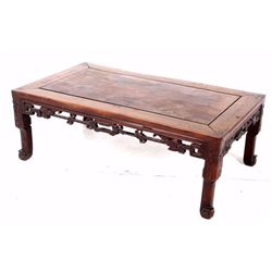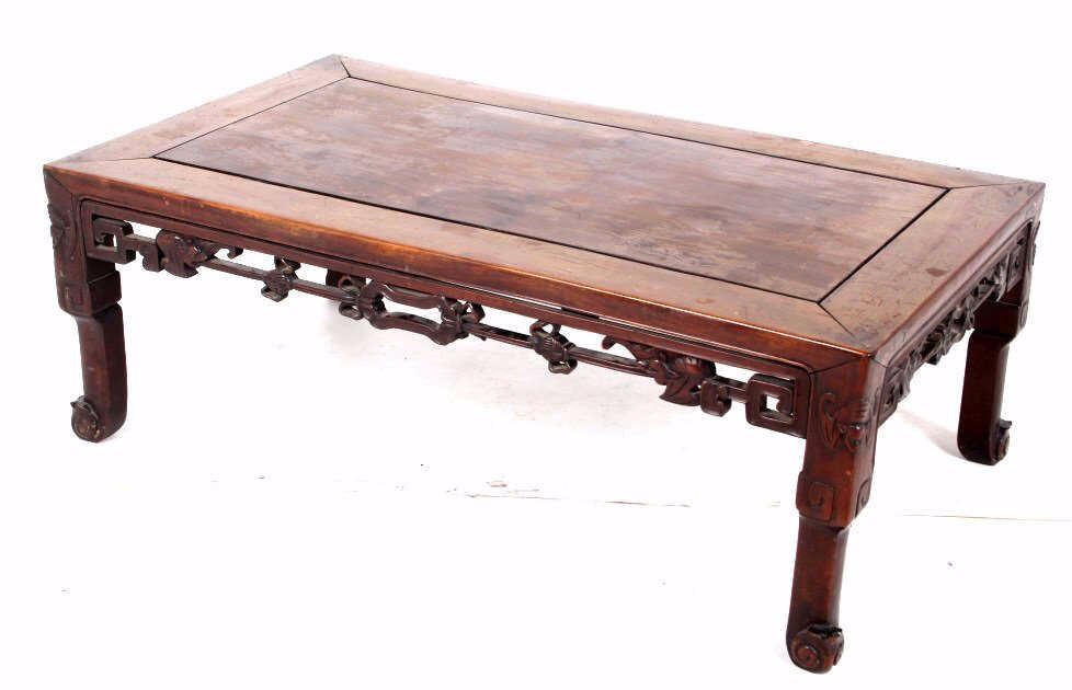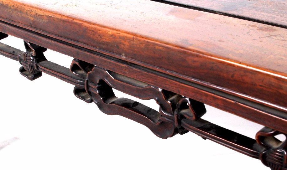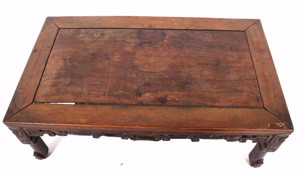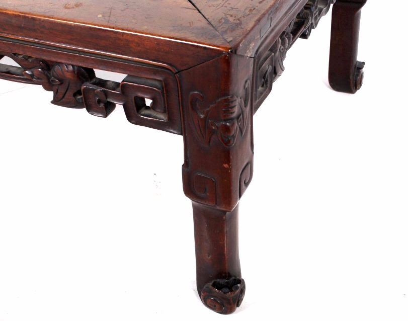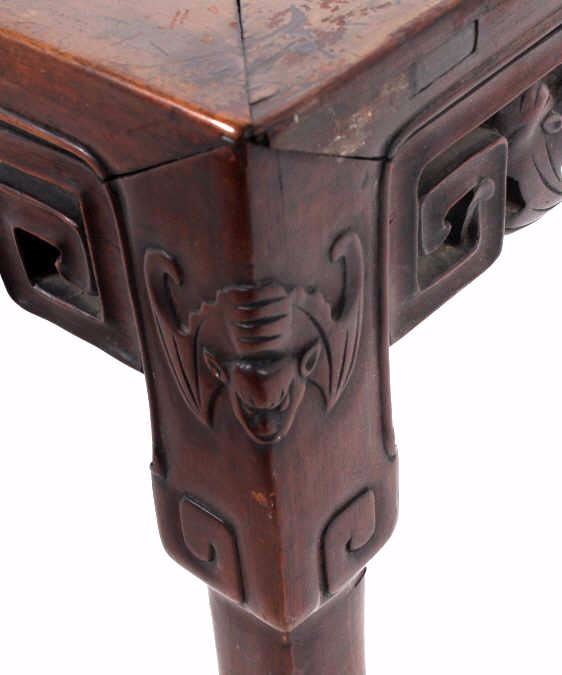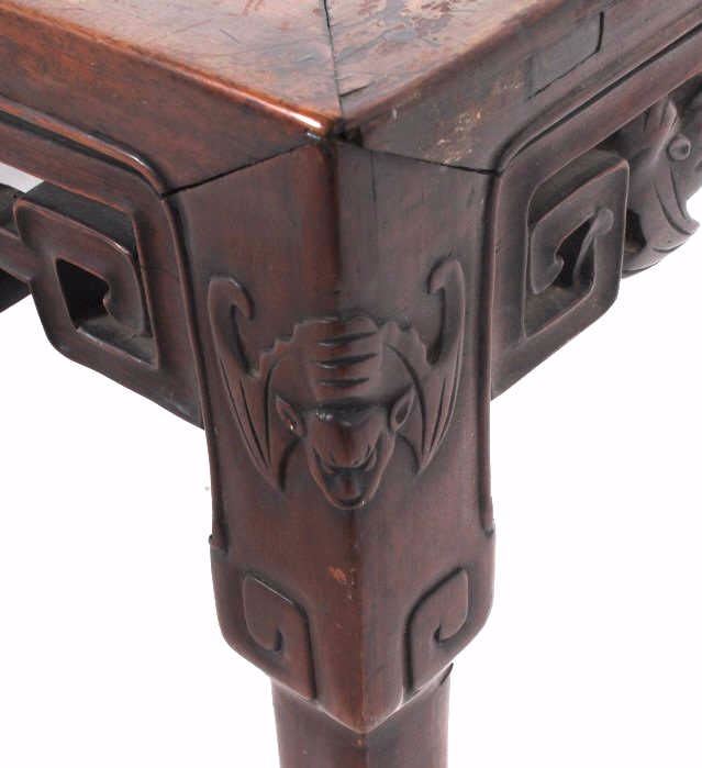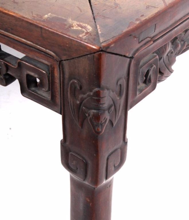 This is an exceptional early Chinese carved bat motif table from the 17th to 19th century. The table has beautifully carved bat accents throughout showing incredibly fine detail. The table displays exceptional quality and artistic craftsmanship. Each leg showsa hanging bat hand carved adornment with hand carved trim showing a winged bat on each end with their tongues tied in knots creating the trim. This table came from the estate of Elias Boudinot. Elias Boudinot IV (B.1740-1821) was the fourth President of the United States Continental Congress from 1782 to 1783. Boudinot was a Member of the Continental Congress (1777-1788; 1781-1784), served in the First Congress of 1789, he signed the Treaty of Paris with Great Britain ending the Revolutionary War as at the time he was the acting President. Boudinot was also the Commissary-General of Prisoners and in 1795 was appointed as Third Director of the United States Mint by George Washington. The table shows good condition. It measures 19.25" x 33.5" and is 11.5" tall. One of the more unique Chinese carved tables.