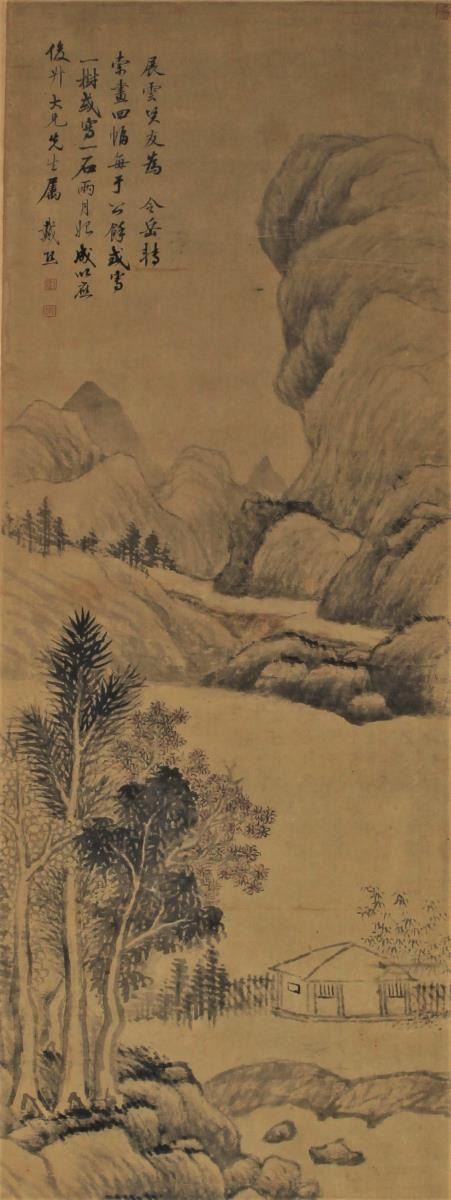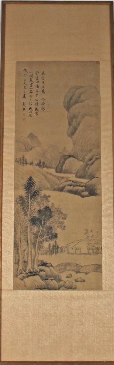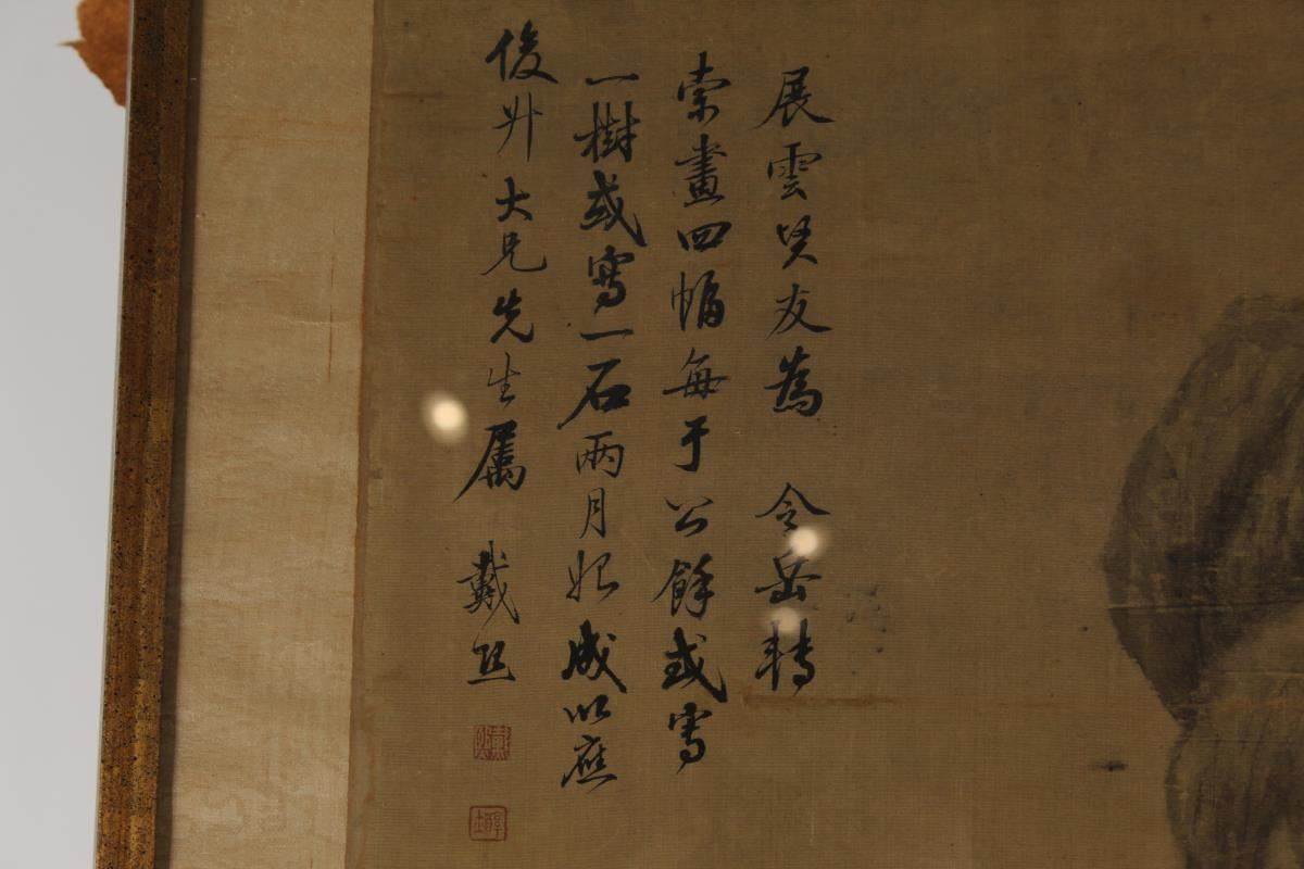 Chinese silk scroll under glass. The Chinese characters talk about trees and the moon.