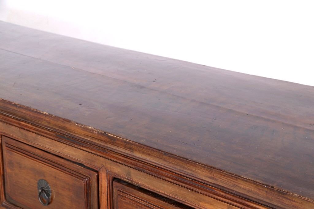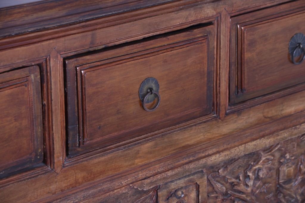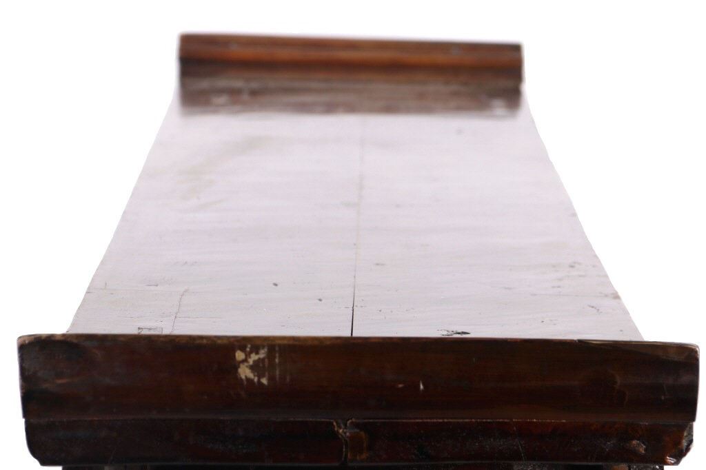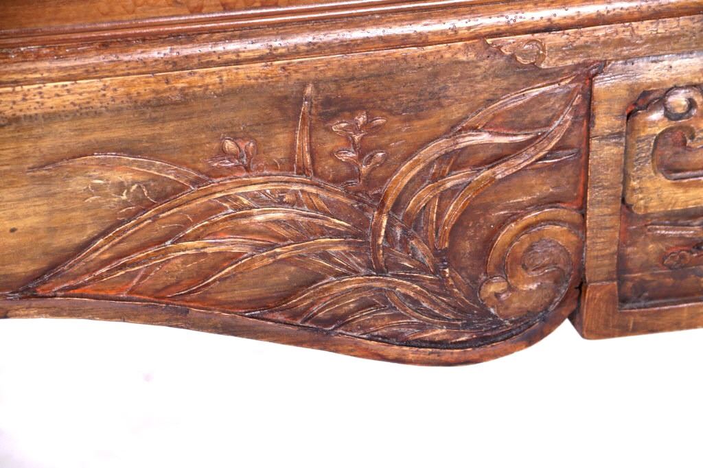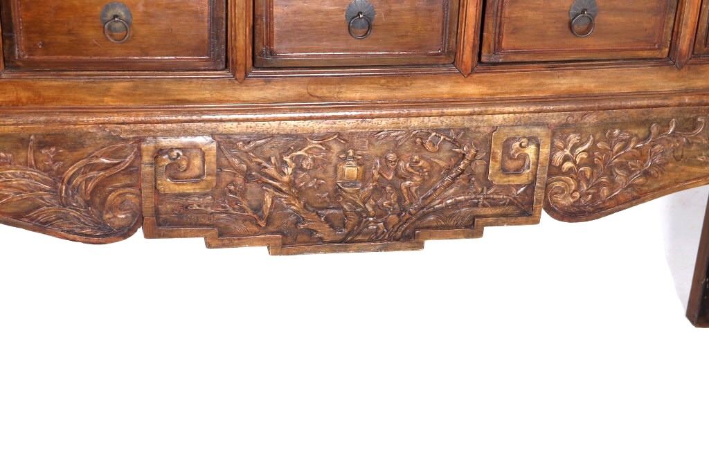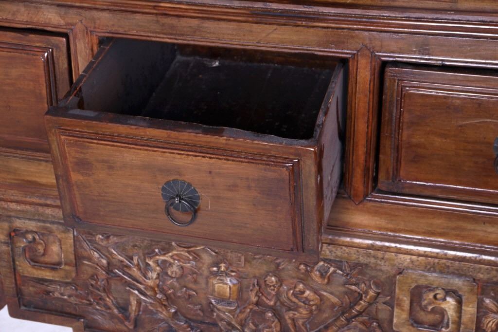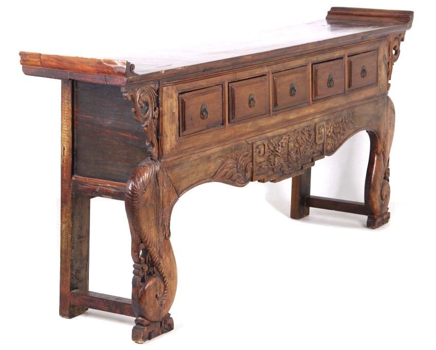 Featured in this lot we have a Chinese painted hardwood alter table originating from the late 1800's. The table shows solid hard wood construction with everted ends, five pull out drawers, and hand carved designs. The table shows a wonderful hard wood top with everted panels at each end. The front of the piece shows wooden pull out drawers with iron hardware. The table features a hand carved waist with a figure scene at the center with geometric and floral designs expanding toward the sides. The front legs show carved designs with a front panel with the back legs showing simple sturdy construction. The table displays a wax import stamp across the top of the leg brace. The piece shows good condition overall with some wear due to age. It measures 99" long by 18 3/4" wide and 44" tall.