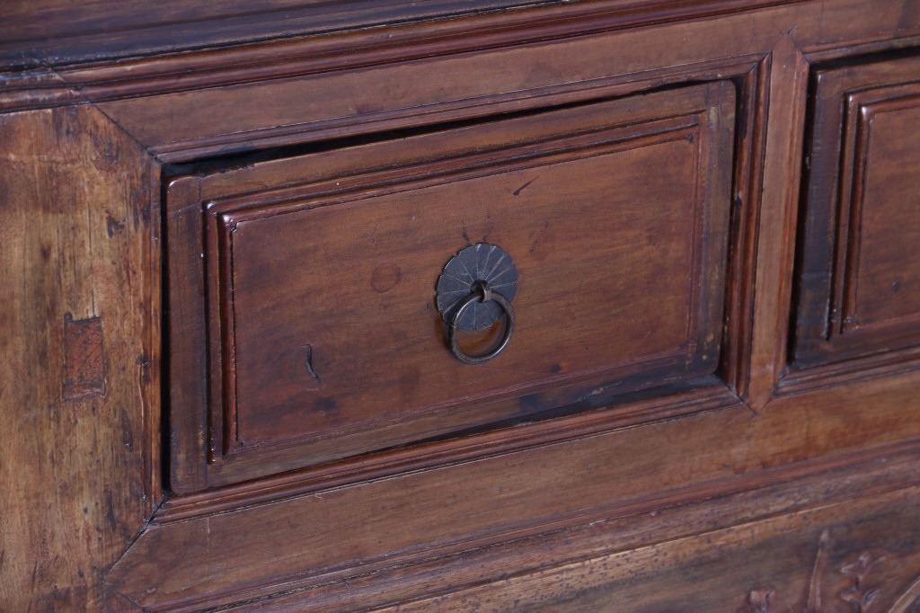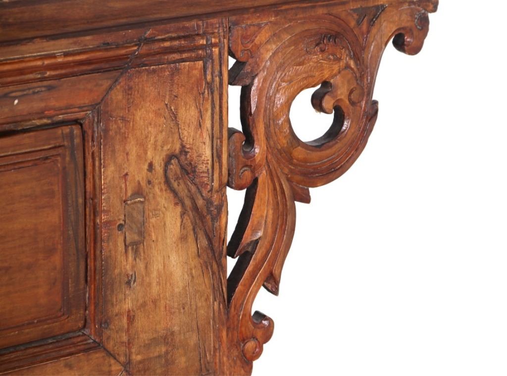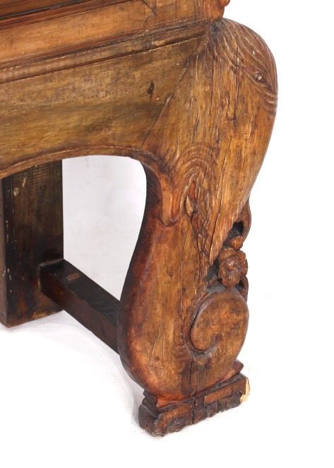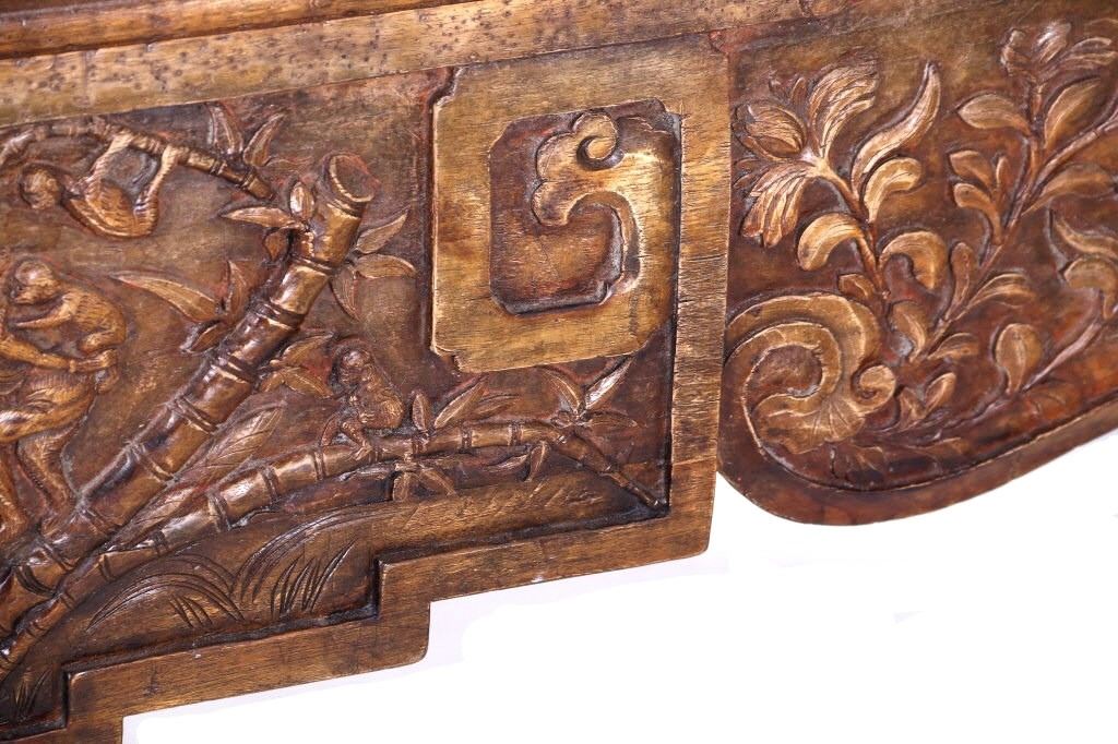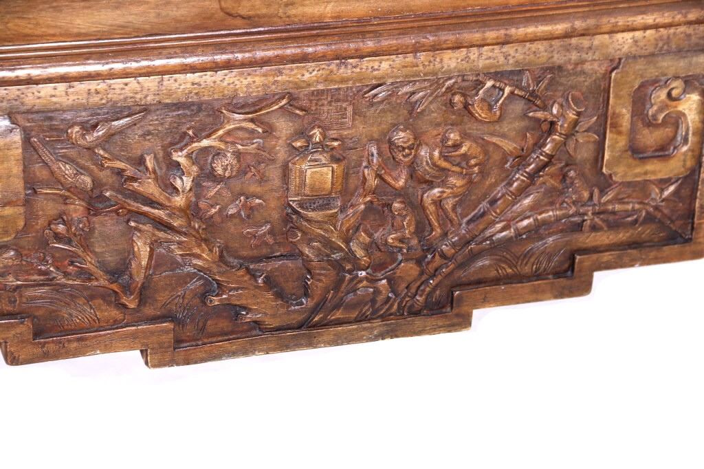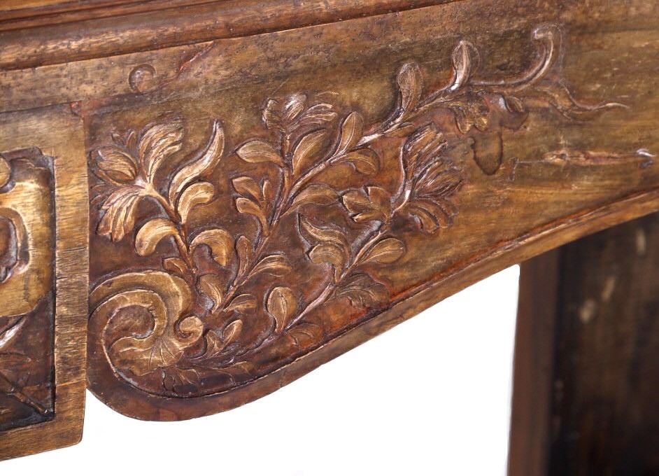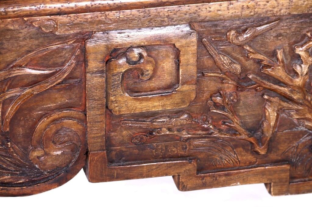 Featured in this lot we have a Chinese painted hardwood alter table originating from the late 1800's. The table shows solid hard wood construction with everted ends, five pull out drawers, and hand carved designs. The table shows a wonderful hard wood top with everted panels at each end. The front of the piece shows wooden pull out drawers with iron hardware. The table features a hand carved waist with a figure scene at the center with geometric and floral designs expanding toward the sides. The front legs show carved designs with a front panel with the back legs showing simple sturdy construction. The table displays a wax import stamp across the top of the leg brace. The piece shows good condition overall with some wear due to age. It measures 99" long by 18 3/4" wide and 44" tall.
