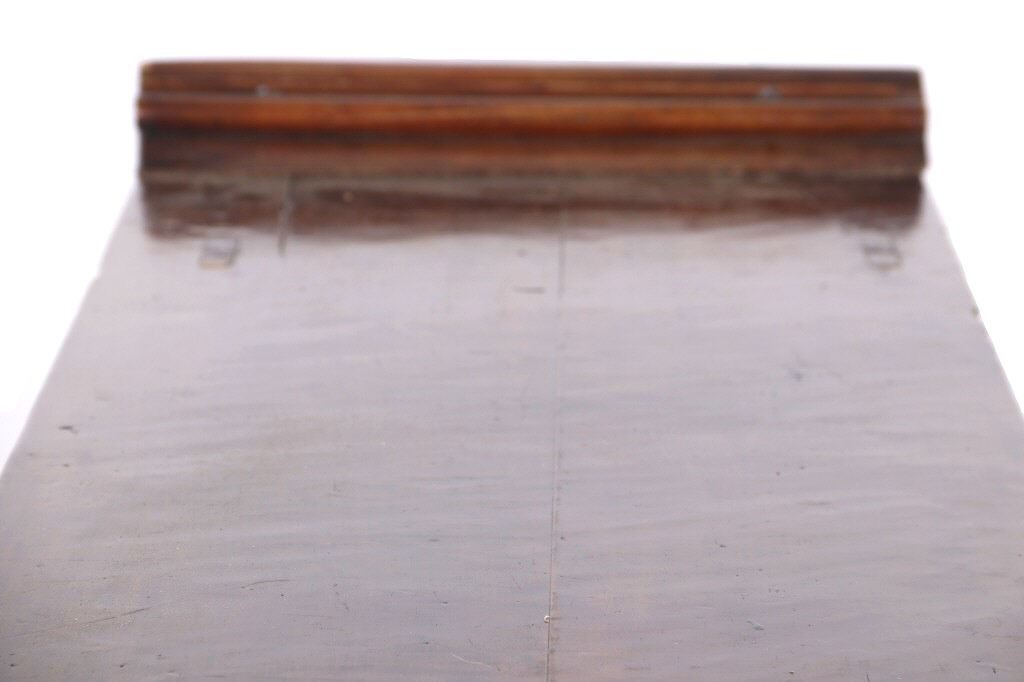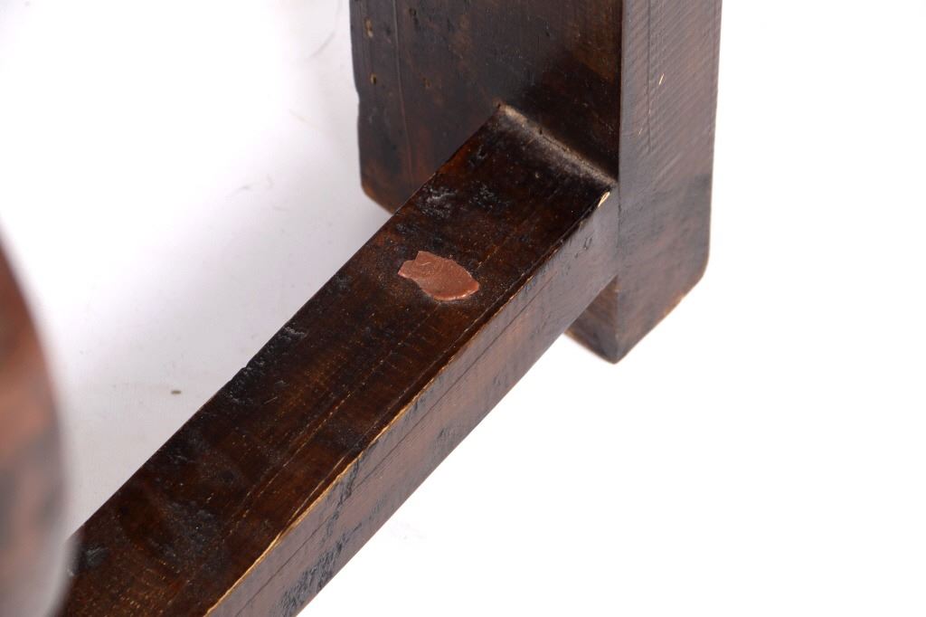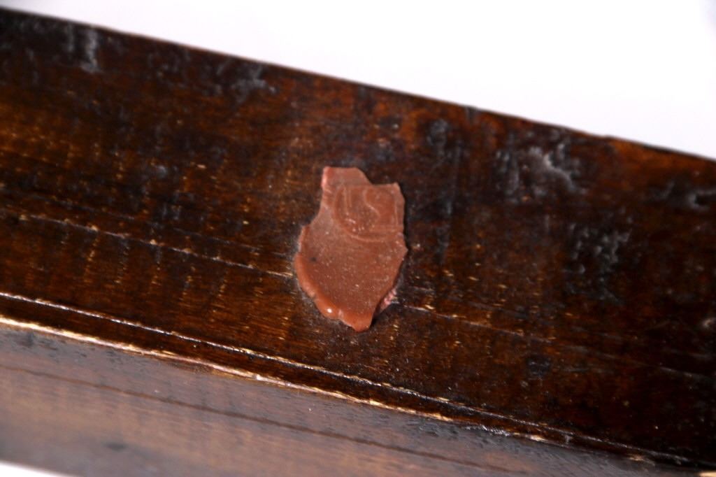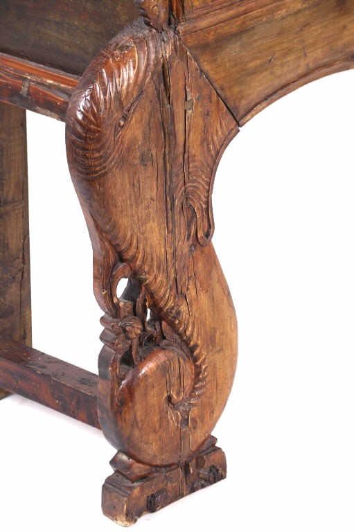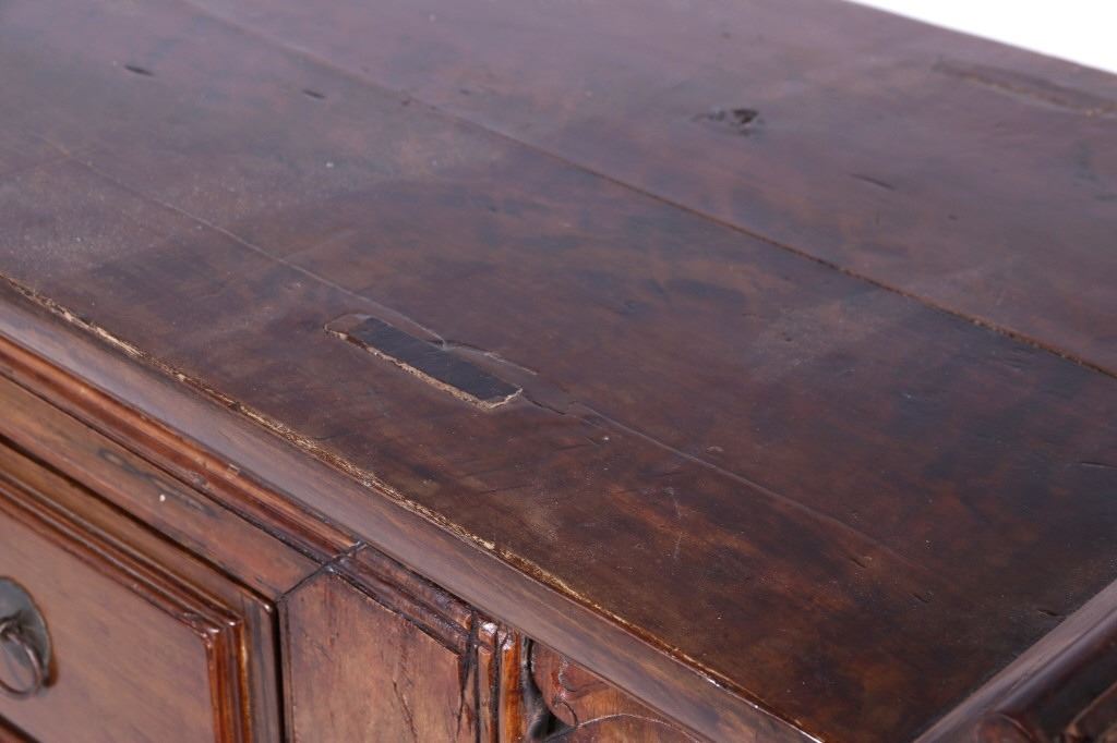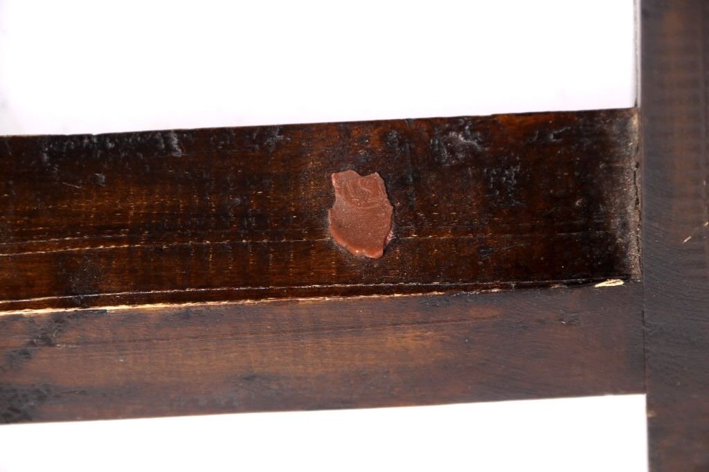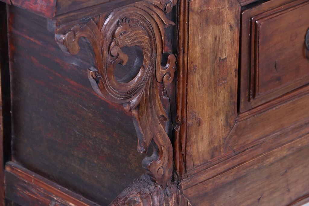 Featured in this lot we have a Chinese painted hardwood alter table originating from the late 1800's. The table shows solid hard wood construction with everted ends, five pull out drawers, and hand carved designs. The table shows a wonderful hard wood top with everted panels at each end. The front of the piece shows wooden pull out drawers with iron hardware. The table features a hand carved waist with a figure scene at the center with geometric and floral designs expanding toward the sides. The front legs show carved designs with a front panel with the back legs showing simple sturdy construction. The table displays a wax import stamp across the top of the leg brace. The piece shows good condition overall with some wear due to age. It measures 99" long by 18 3/4" wide and 44" tall.