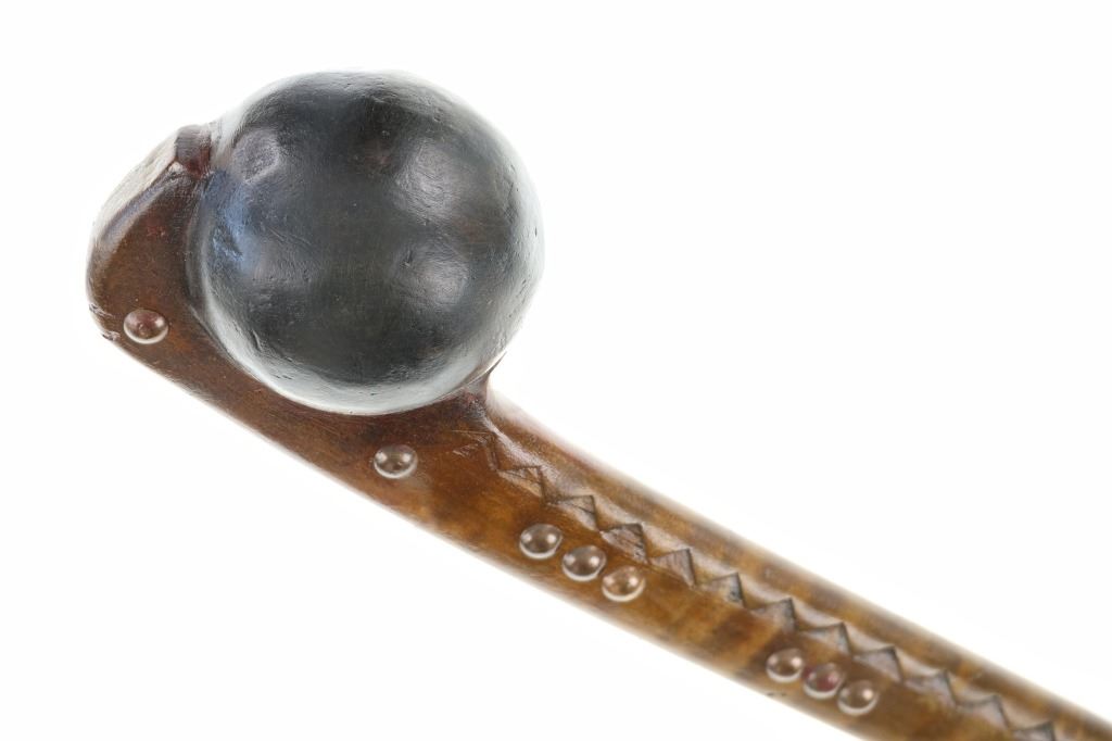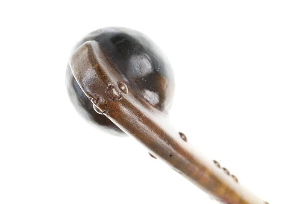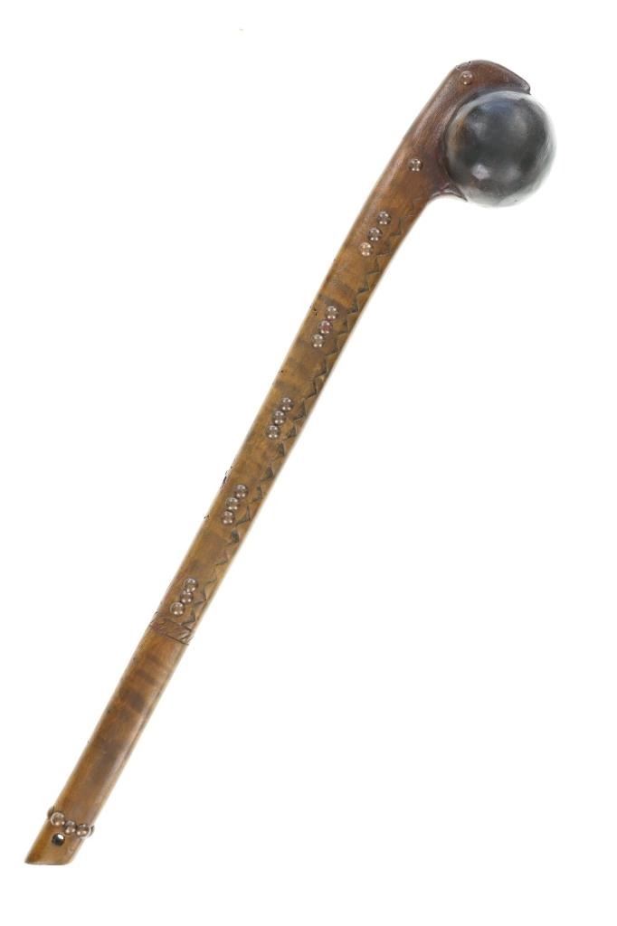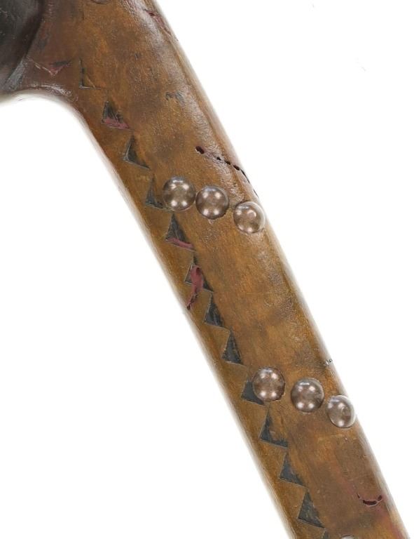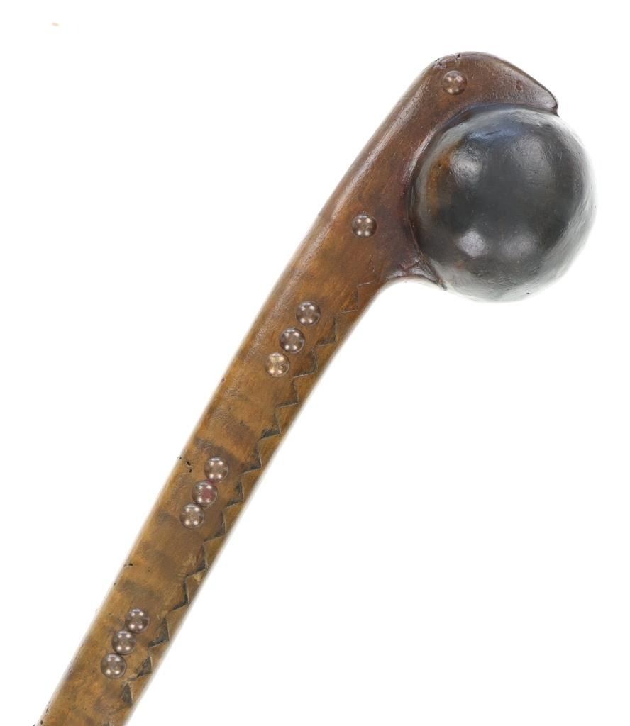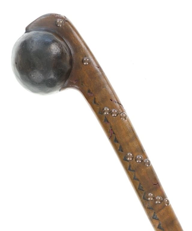 This is a fine carver root ball war club with a nice early to antique age in the pattern of the upper New York Iroquois examples. The club shows a root ball carved with “D” shaped top, solid mostly straight handle with tapered foot all carved from tiger maple wood with nice figuring. There are high relief chip carvings and some old paint along with a pierced hole at the bottom which would held a wrist throng. The piece is adorned with later added brass metal tacking as well. A nice antique example that measures 23-inches in length and the ball being about 3-inches across.