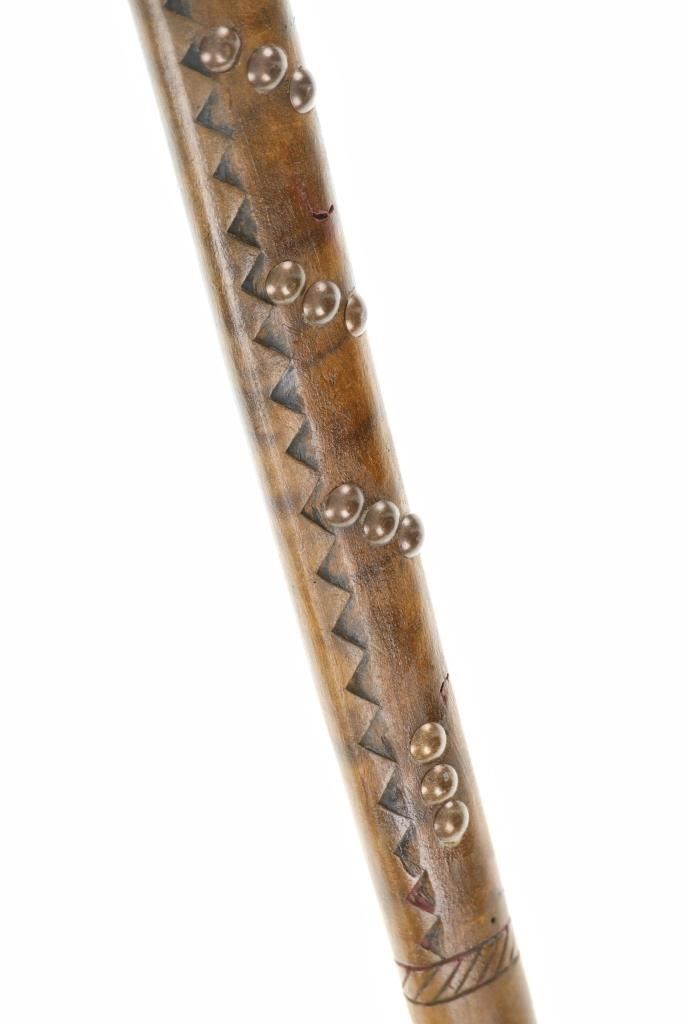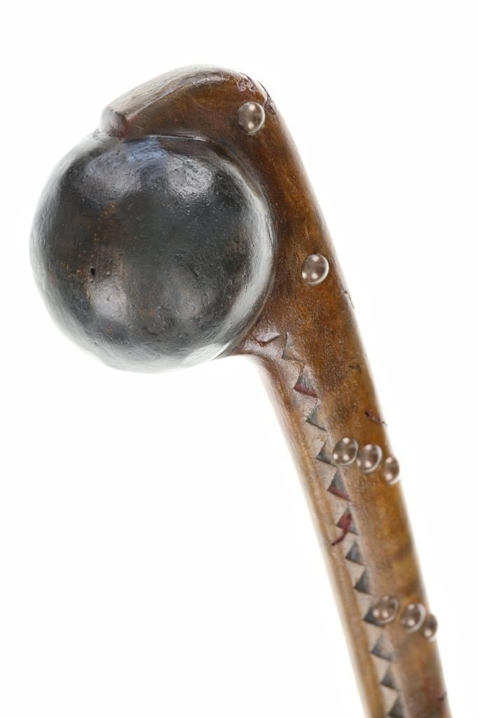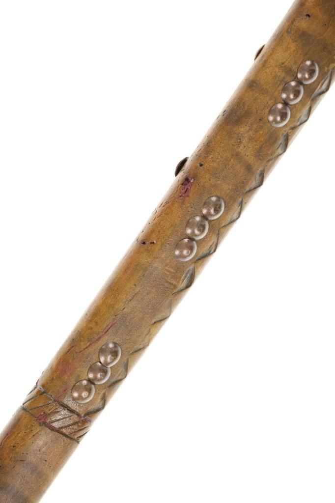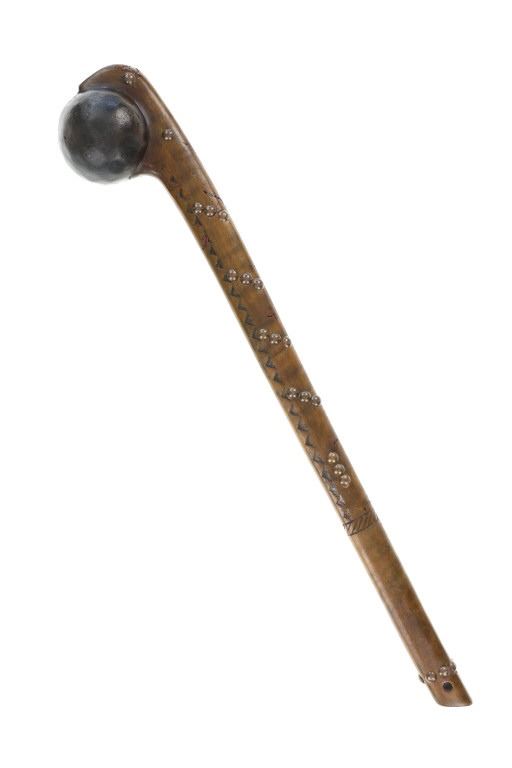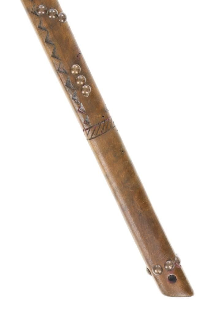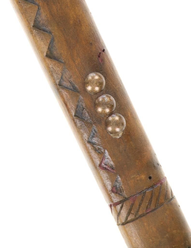 This is a fine carver root ball war club with a nice early to antique age in the pattern of the upper New York Iroquois examples. The club shows a root ball carved with “D” shaped top, solid mostly straight handle with tapered foot all carved from tiger maple wood with nice figuring. There are high relief chip carvings and some old paint along with a pierced hole at the bottom which would held a wrist throng. The piece is adorned with later added brass metal tacking as well. A nice antique example that measures 23-inches in length and the ball being about 3-inches across.