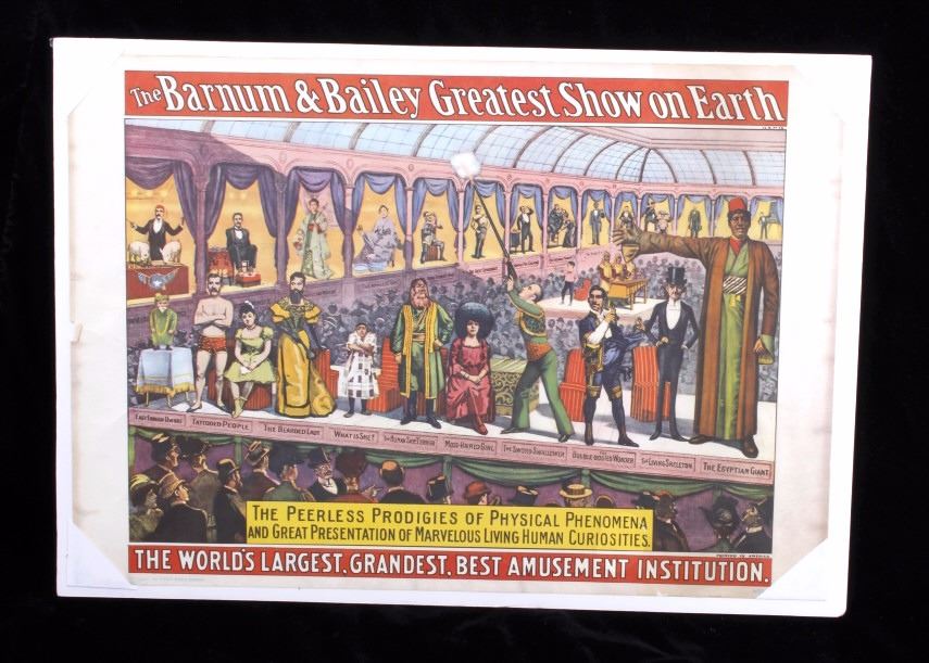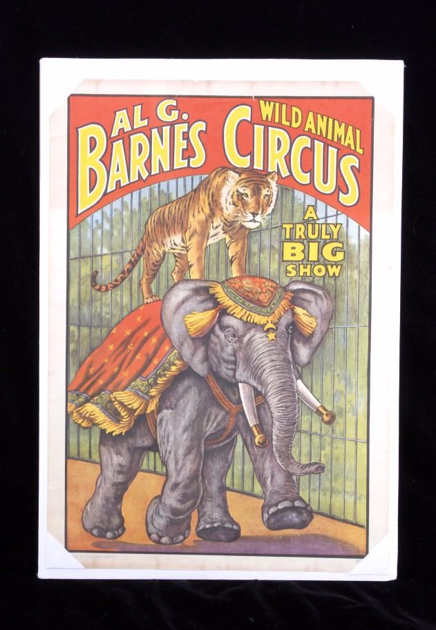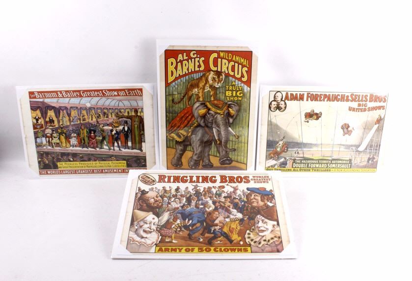 This lot features a set of four circus advertising posters. These posters are original prints form the 1960s. The set features posters from Al G. Barnes wild animal circus, Adam Forepaugh & Sells Bros Big United Show, The Barnum & Bailey Greatest Show on Earth, and Ringling Bros. All of the posters have been shrink wrapped for display. The overall condition of the set is good. Measures: 14" H x 20" W