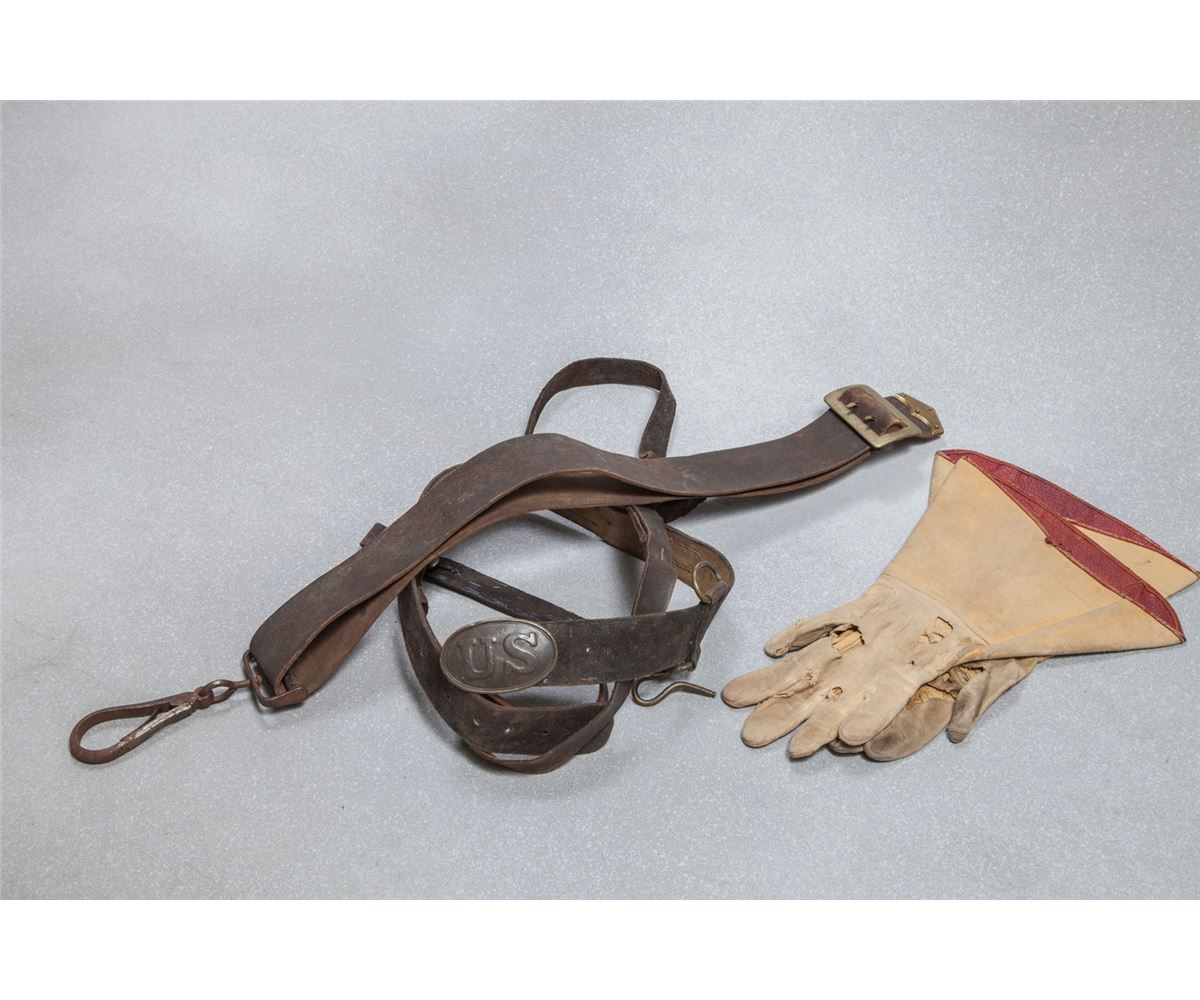 a) Black Buff Model 1855 belt with saber straps and shoulder strap, oval U.S. buckle. Very good condition overall.