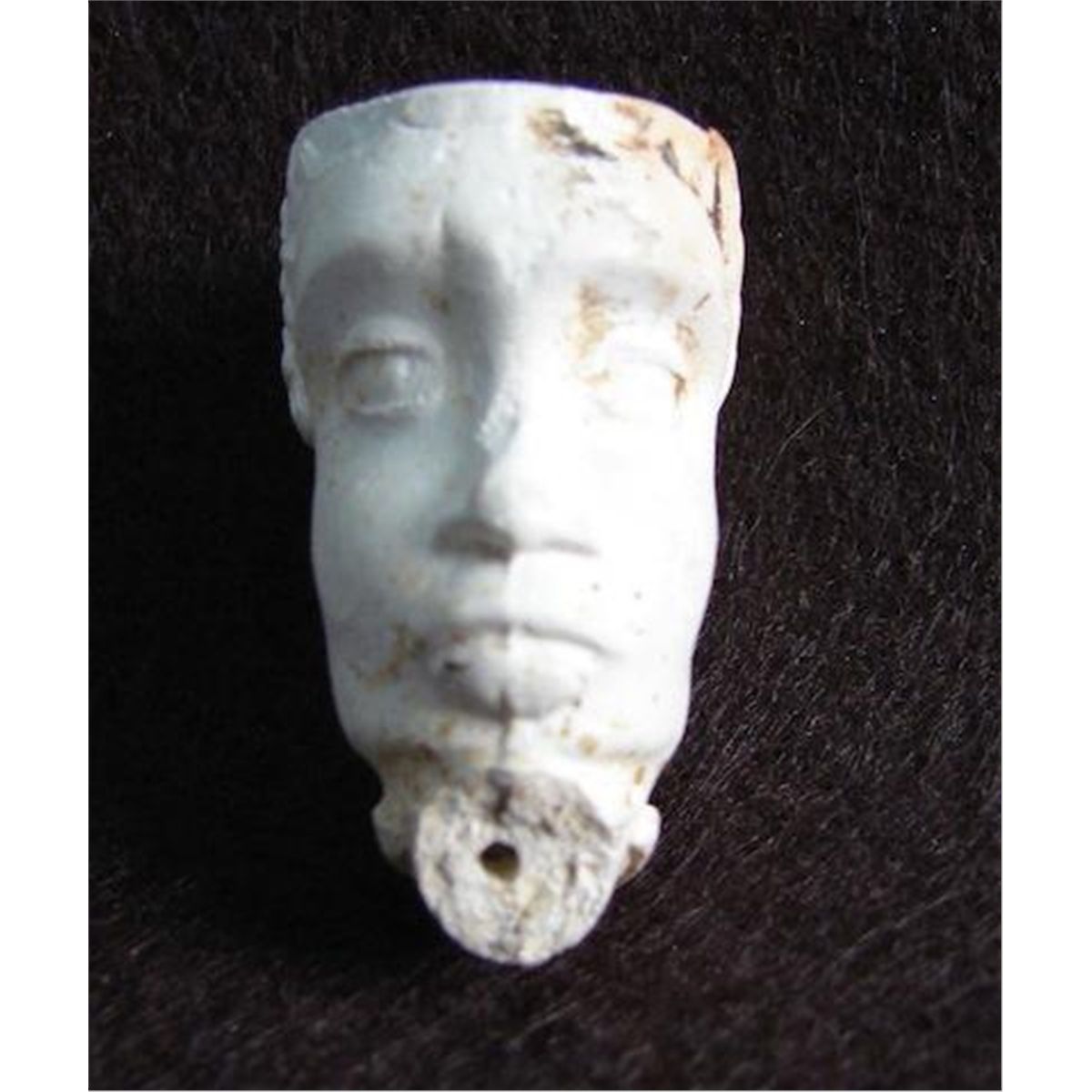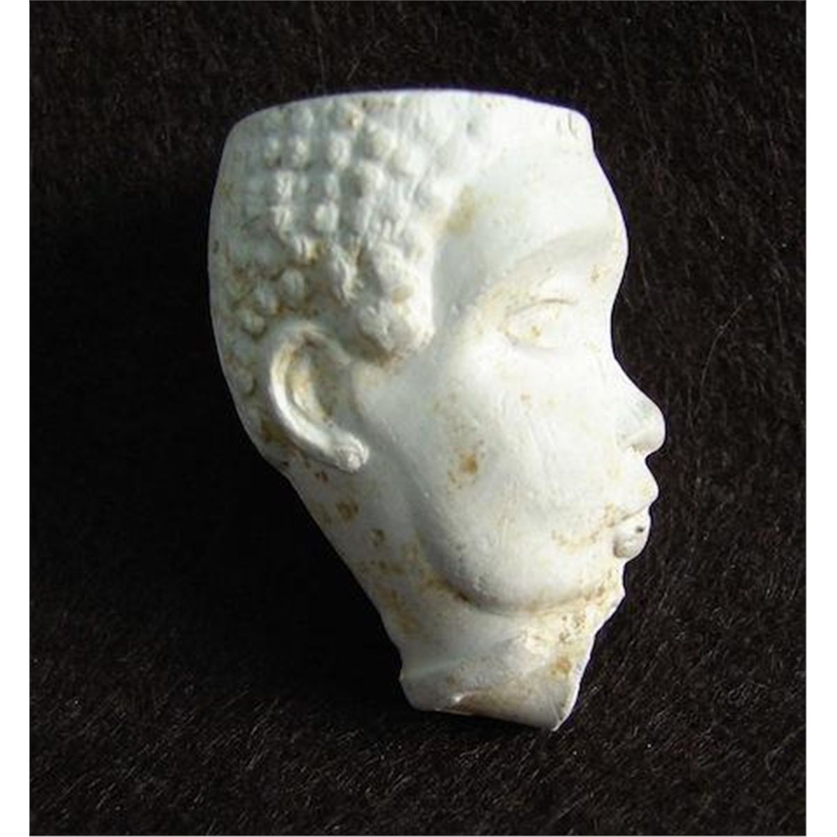 Early Clay Pipe depicting the head of Southern Slave during the 1840 to 1860 period. This pipe was unearthed at a tavern site in South Carolina and were most probably cast in the south and given to bidders at the time slave sales were routine in and around Charleston Market. Measures 1.5 inches H mwf1534c