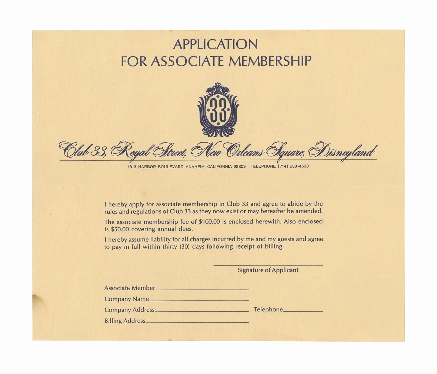 (Disneyland, c.1967) An extremely rare first year application for Associate Membership to Club 33 in New Orleans Square. If a business purchased a Corporate Membership, they could designate a fixed number of employees as eligible for Associate Memberships, which were offered at a much lower cost than an Individual Membership. For this early Associate application, the membership fee was a mere $100.00, with a $50.00 annual fee. Measuring 7"x8.5", the application is in good condition with a central horizontal crease and a scuff to the lower left corner.