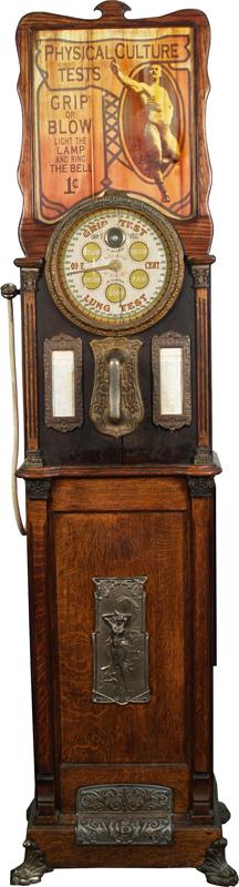 Early Coin-Op Floor Model Caille Bros. "Mascot Grip Test - Lung Test" Arcade Machine w/ marquee & keys