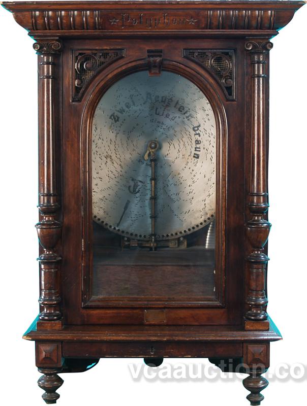 Early Coin-Op Ph. Hakkert Jr. Polyphon "Automaton" 19-5/8" Disc Player, Style 104 or similar, also called "Sandringham" or "Osbourne" c1890's w/ 18 discs, has been electrified and comes with original hand crank and mechanism - 28" x 16" x 38" tall