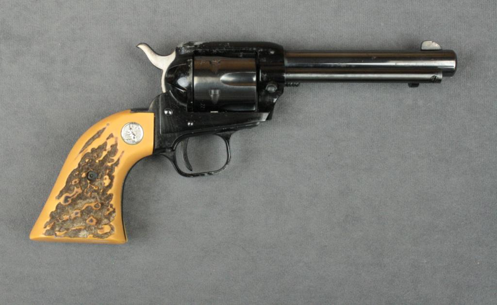 Early Colt ’62 (1962) Frontier Scout SAA revolver in factory cardboard box with insert and extra cylinder, blue finish, faux stag grips, #65267P. This gun is in overall uncleaned very good to fine condition showing majority of original finish with some scattered points of surface rust from storage, fine bore, action and markings, grips are also fine; box is overall very good with some scuffing and wear. Est.:$250-$500.