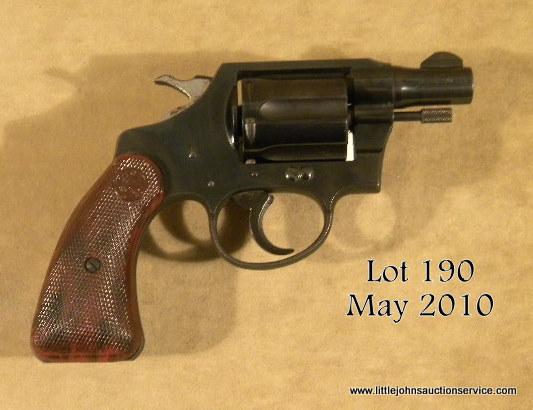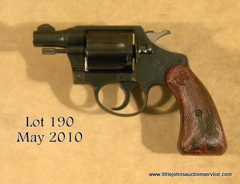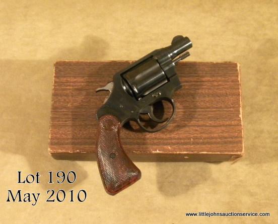 Early Colt Detective Special hand ejector revolver, .38 Colt cal., 2” barrel, blue finish, checkered Colt mottled red plastic grips, #516836. This gun is in overall excellent condition showing approx. 98%+ original finish with just acouple small spots of surface erosion that should clean; excellent bore, action, markings and grips. The gun is accompanied by a wood grain Colt cardboard two piece box for a Cobra revolver with a cleaning rod, Handling instructions and “10Commandments of Safety” flyer. Est.: $300-$500.
