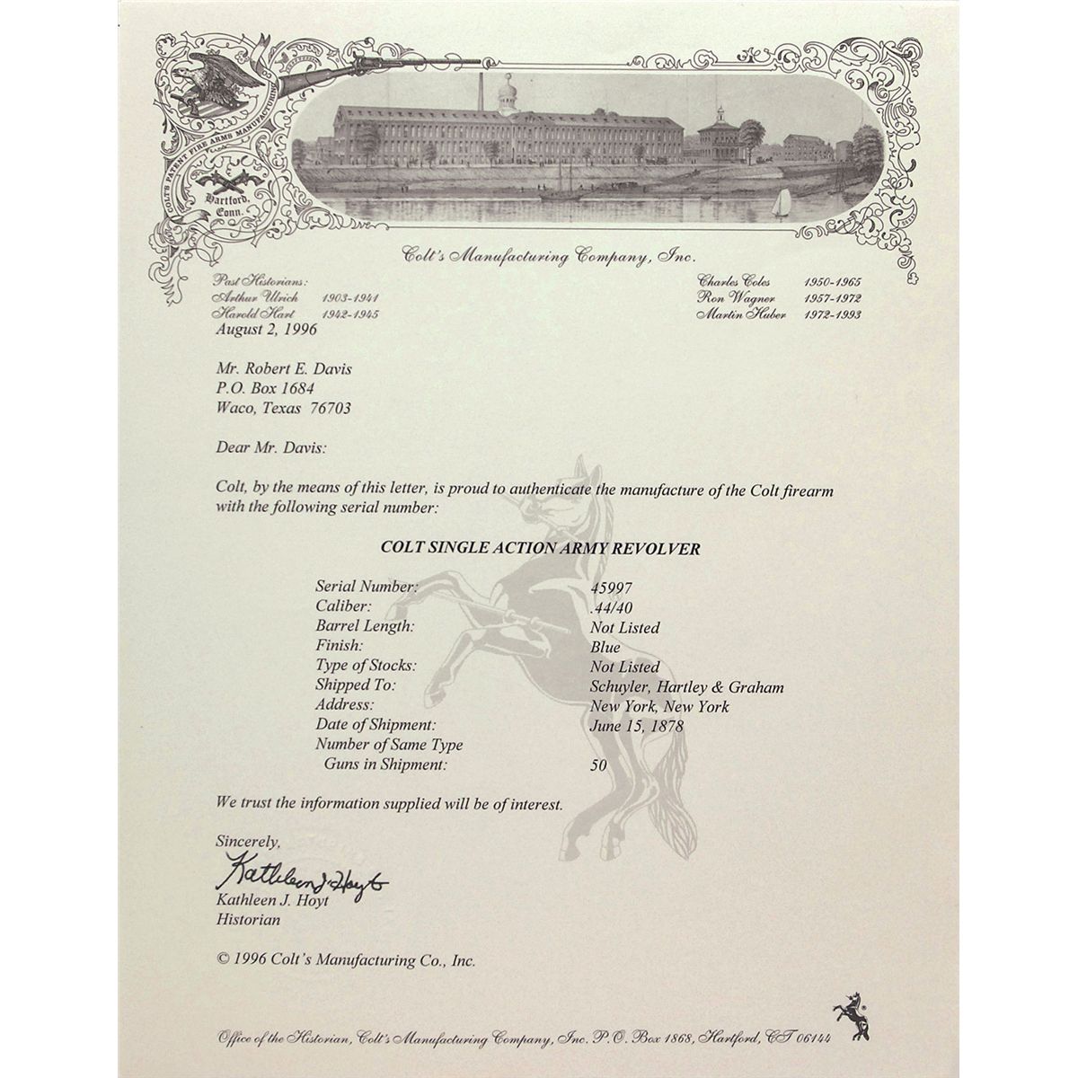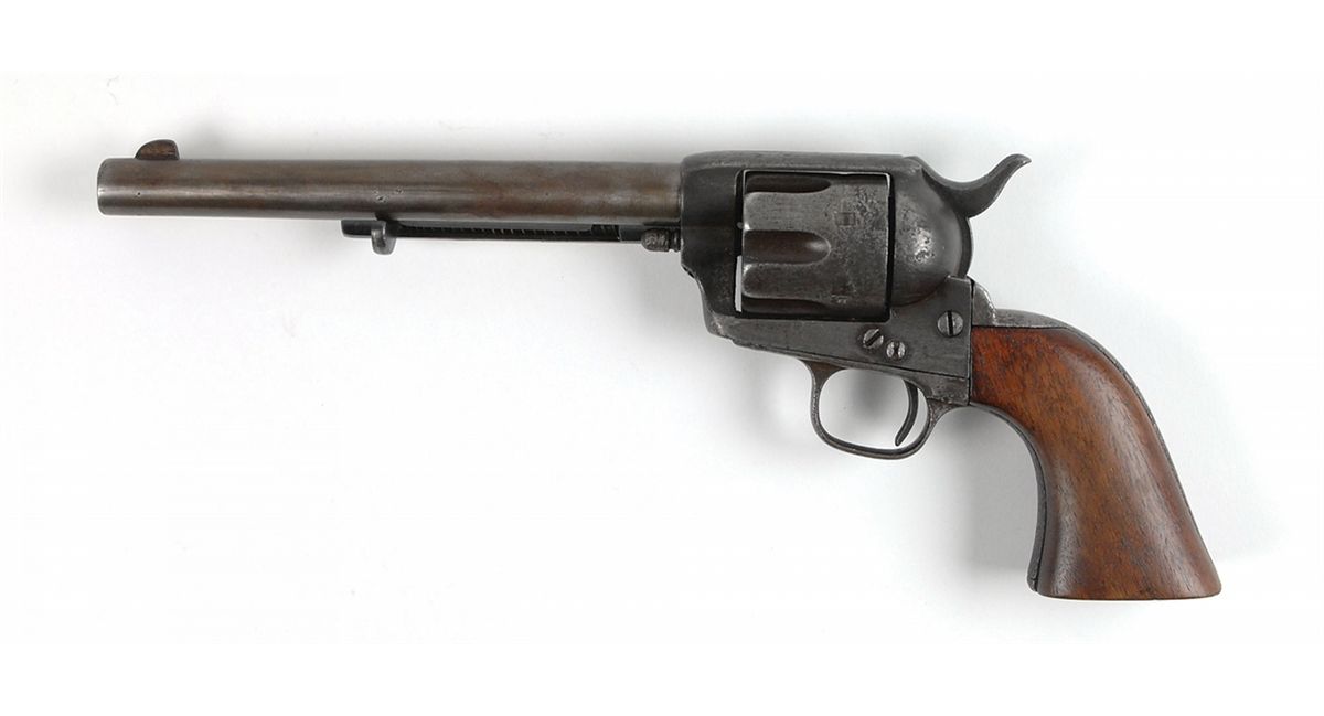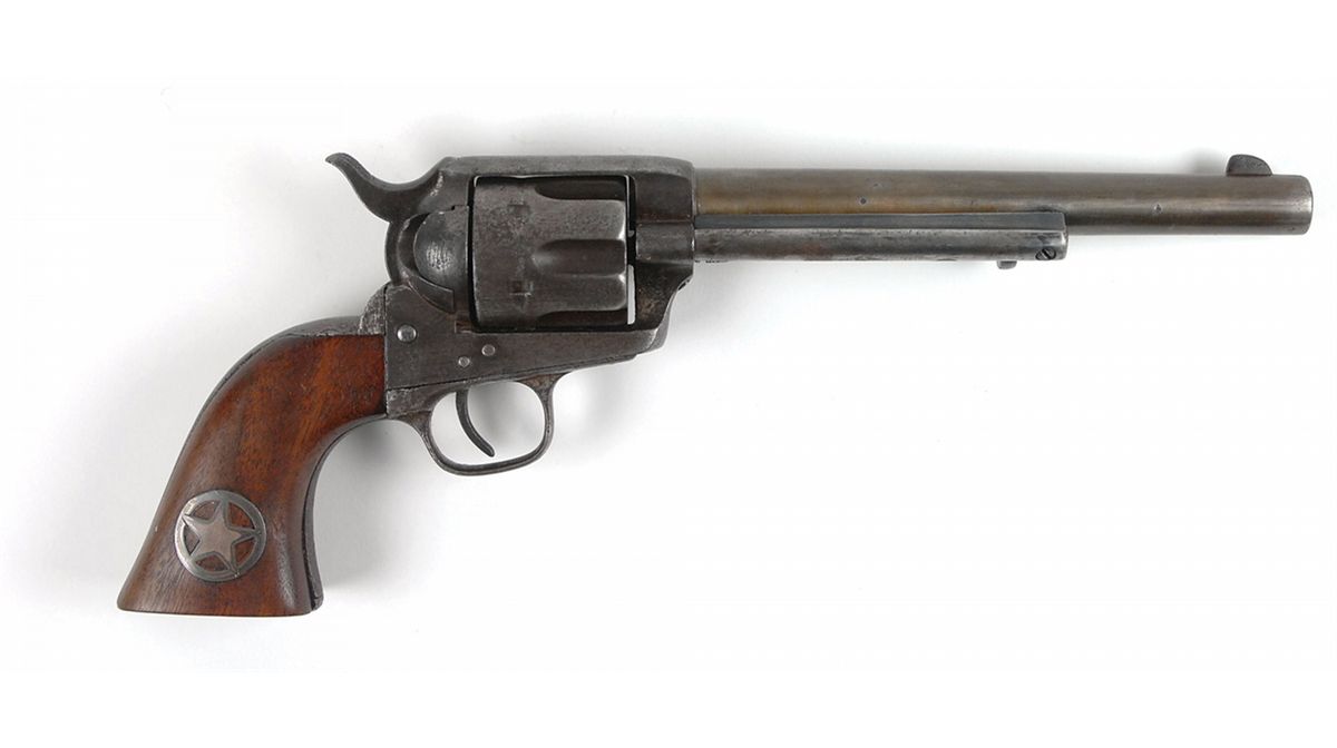 #45997, cal. .44-40. The factory barrel is slightly short at 7 3/8? (1/8? shorter than the original factory length of 7.5? due to filing off dings at the muzzle). The surface of the barrel was cleaned long ago and the barrel has an even plum patina with a legible factory address and no trace of the etched barrel panel remaining. The serial numbers match on the frame, gripstraps, barrel, and cylinder—the last two parts have only the last digit of the serial number remaining and are definitely original to the gun. The barrel has a dark bore with worn rifling. The cylinder revolves properly, the hammer safety notch is worn and the trigger spring is broken. One backstrap screw is missing. The ejector housing is a later replacement and retains factory blue on the protected areas, the ejector rod head is the later crescent style and is gunsmith made. The frame patent markings are mostly legible and the surfaces have a mixed dark gray patina, as do the gripstraps, cylinder, and hammer. The ‘one-piece’ walnut grip is a non-factory replacement that fits well and is in fine condition with an inlaid sterling silver Texas Ranger-style badge in the right side. This is a good example of the ‘Frontier Six Shooter’ popular in the Old West. Included is a Colt factory letter indicating this was shipped to Schuyler, Hartley, & Graham in New York City on June 15, 1878.