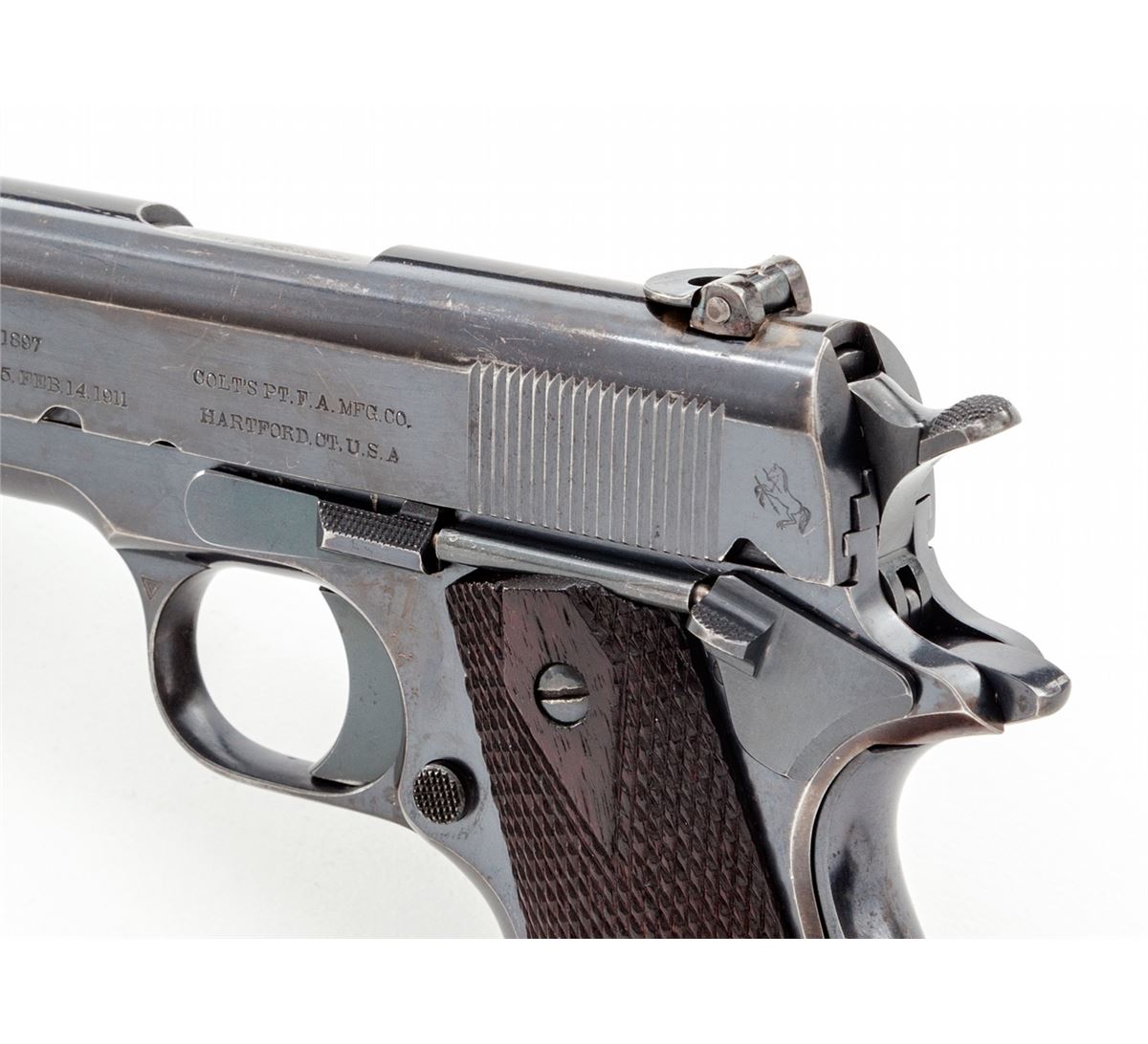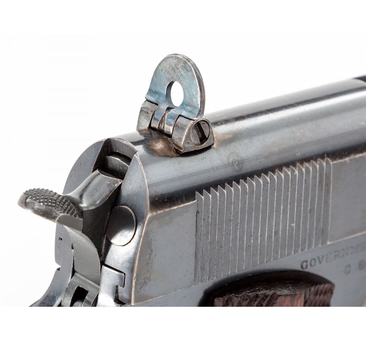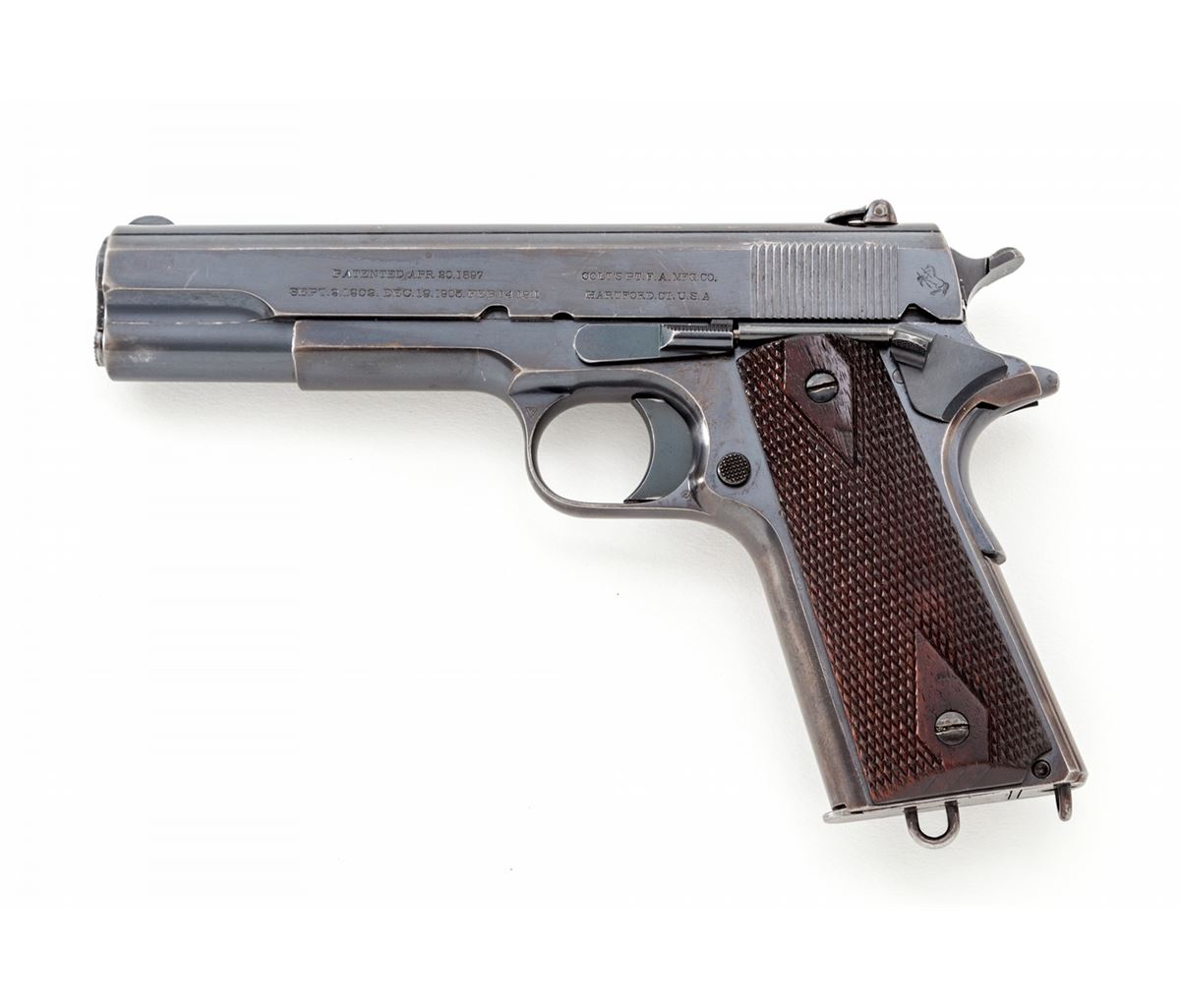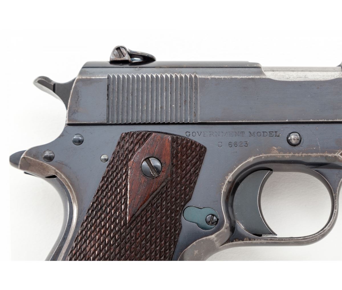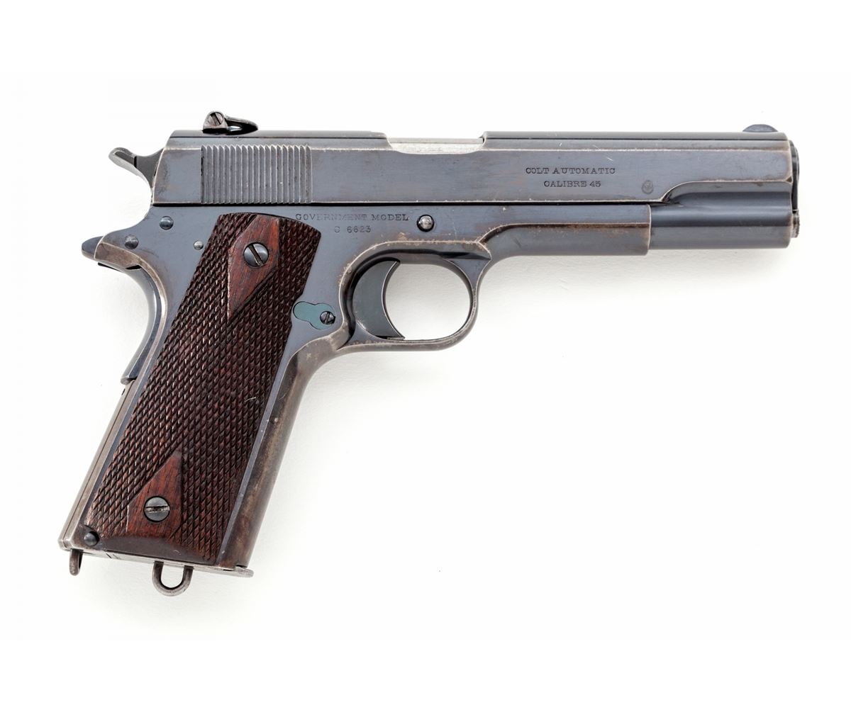 Early Colt Government Model Semi-Automatic Pistol, #C6623, .45 ACP cal., 5'' barrel, blue finish, factory checkered walnut grips, with one early lanyard loop two-tone keyhole magazine and special period ghost ring flip-up rear sight. Shipped to Mrs. Powell Fauntleroy, Sept. 8, 1914, as a wedding gift for her husband. (See Goddard, ''The Government Model'', page 256.) Condition is near excellent retaining approx. 94% thinning and toning blue, with circular scratches from slide stop to frame and into slide. Magazine housing and front strap both retain nearly 20% thinning blue. Grips with minor flattening. Action is crisp, bore is bright. Est.; $4,500-$6,000. (C&R/PPT)