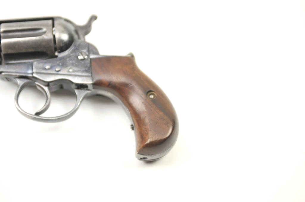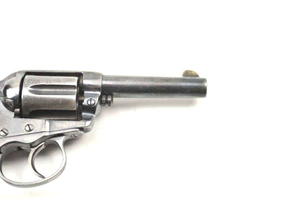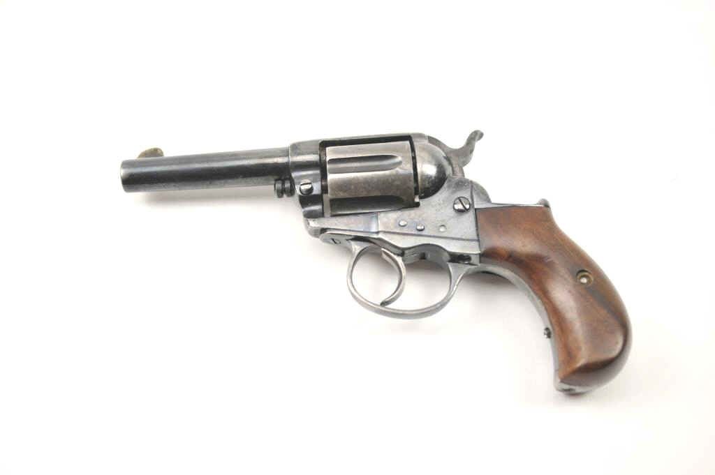 Early Colt Model 1877 Lightning DA revolver, .38 caliber, Serial #7629. The pistol is in very good overall condition as re-finished with a 3 ½” barrel. The pistol retains a significant amount of an older re-bluedfinish with the markings only partially visible other than a crisp barrel address. The smooth wood replacement grips are in very good condition and fit well. The bore is fair and the action is functioning at thetime of description on this 1877 Storekeeper’s model circa 1878. Est.: $300-$600. (Antique).