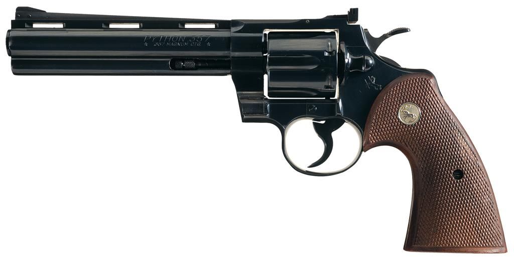 Manufactured in 1958. Has a serrated ramp front sight and a fully adjustable rear sight. Fitted with a set of first generation fully checkered walnut grips with gold Colt medallions.