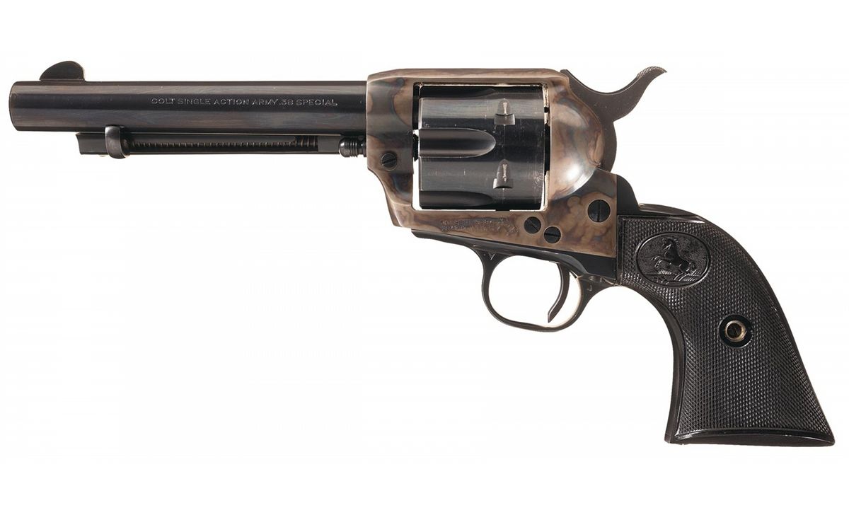 Manufactured in 1957, the second year of production for the Second Generation Single Action Army revolvers. The barrel has with the one line address on top "COLT SINGLE ACTION ARMY .38 SPECIAL" on left side. The left side of the frame has the two line, three patent dates followed by the Rampant Colt. Matching serial and assembly numbers.