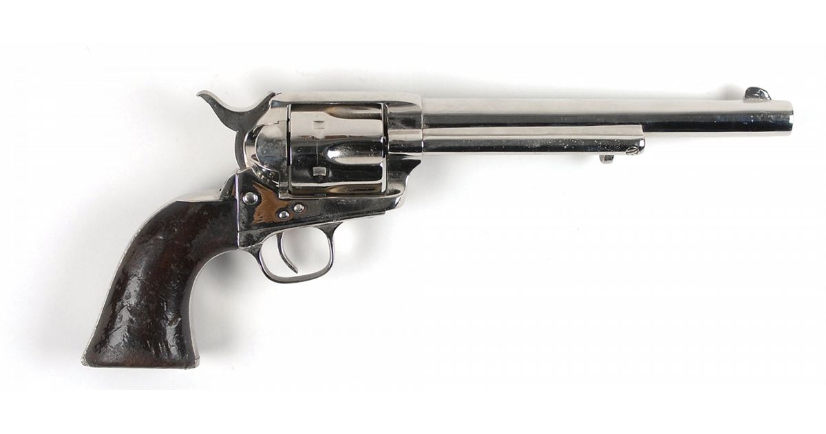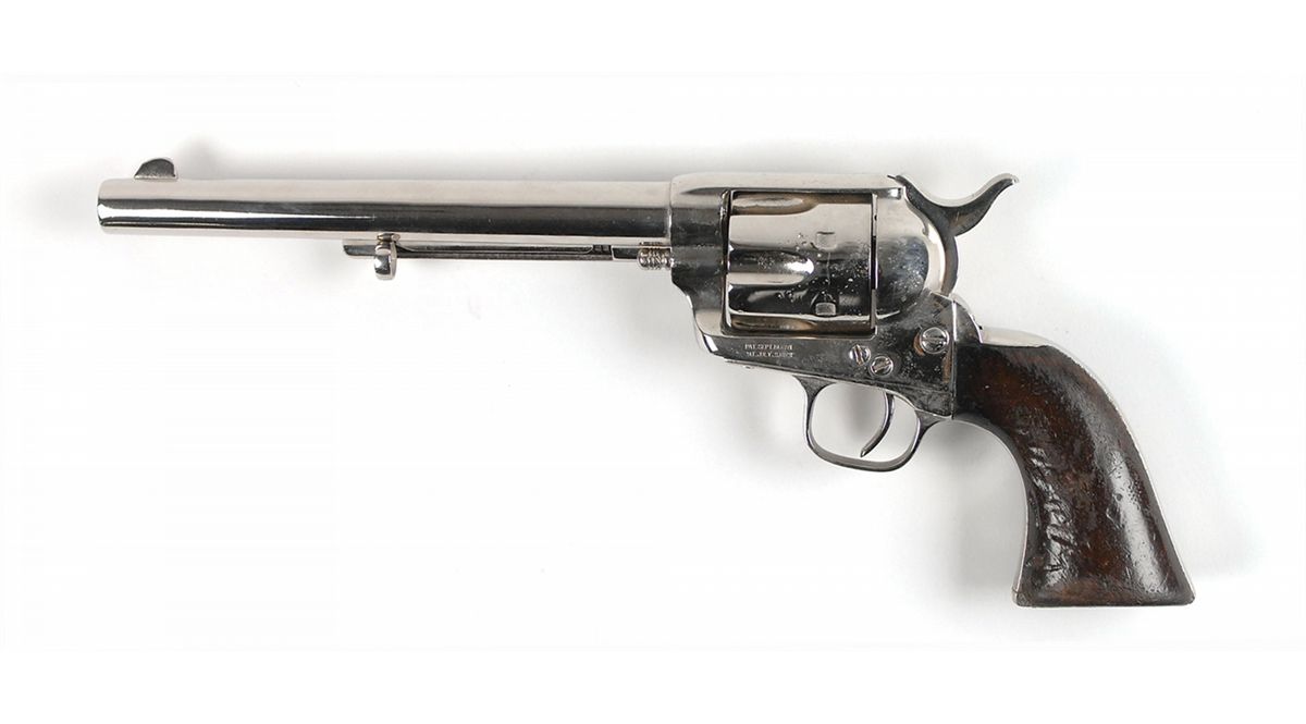 #28825, cal. .45 Colt, 7.5? barrel with a dark bore and worn rifling. The front sight slightly altered, the barrel has the early italic marking for factory address. The serial numbers match on the frame and gripstraps, the last two digits are visible on the barrel, and the cylinder number is illegible. The revolver retains all of a good-looking nickel-plated refinish with a clear two-line patent marking on the frame and a partially legible barrel address. The cylinder and ejector housing have some light pitting under the finish. The one-piece walnut grip is in good condition and shows moderate wear. The mechanism functions well. This old Colt S.A.A. was made in 1876, the same year as the Custer Massacre. This is an antique revolver and will transfer with no Federal restrictions.