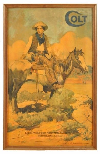 Original Colt advertising poster, scarce Mexican version, marked E.U.de A. (Estados Unidos de Americanos) on the bottom. From drawing by Frank E. Schoonover. Frame: 21-1/2" x 33".