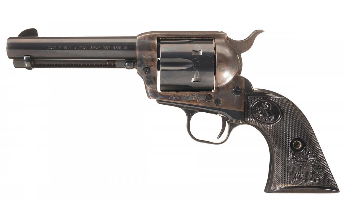 Manufactured in 1977. Standard markings with matching numbers on frame, grip straps and grips. Fitted with checkered Rampant Colt/eagle grips.
