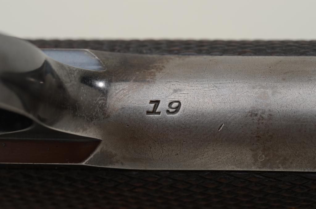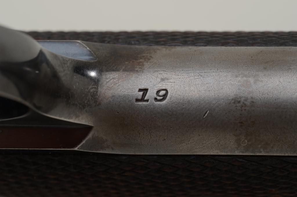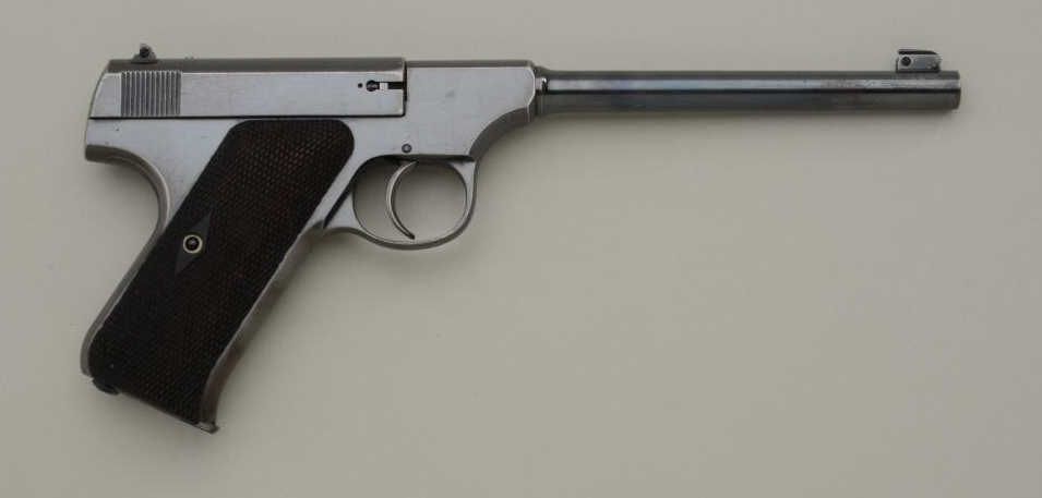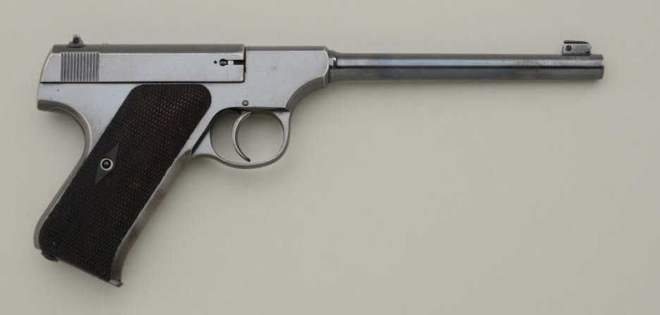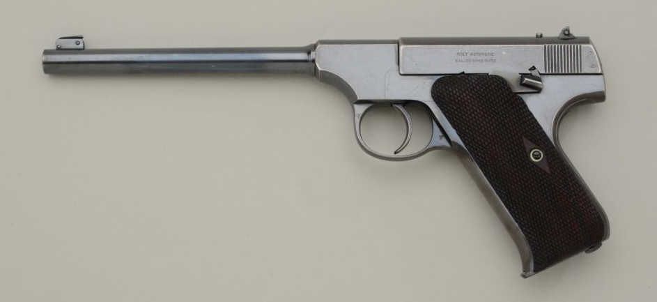 Early Colt Woodsman .22 caliber semi-automatic pistol with 2 digit serial number 19. This Woodsman was made in 1915 according to Colt factory letter which states blue finish, shipped to J. H. Lau and Co.New York, New York, August 12, 1915, 1 gun in shipment. This woodsman shows early barrel address and all early features and retains 75% to 85% original bright blue. The loss of finish is mostly on the straps and highpoints. The grips are very good plus. The markings are also very sharp and the bore is bright. A two-tone Colt marked clip is included. Only approximately 900 Woodsmans were made in their 1st year of production and 2 digit numbers are a prize to Colt collectors. From the collection of Joe Kiser former president of Colt Collectors Association and one of the Western United States most renowned old-time collectors.Est.: $2000-$4000