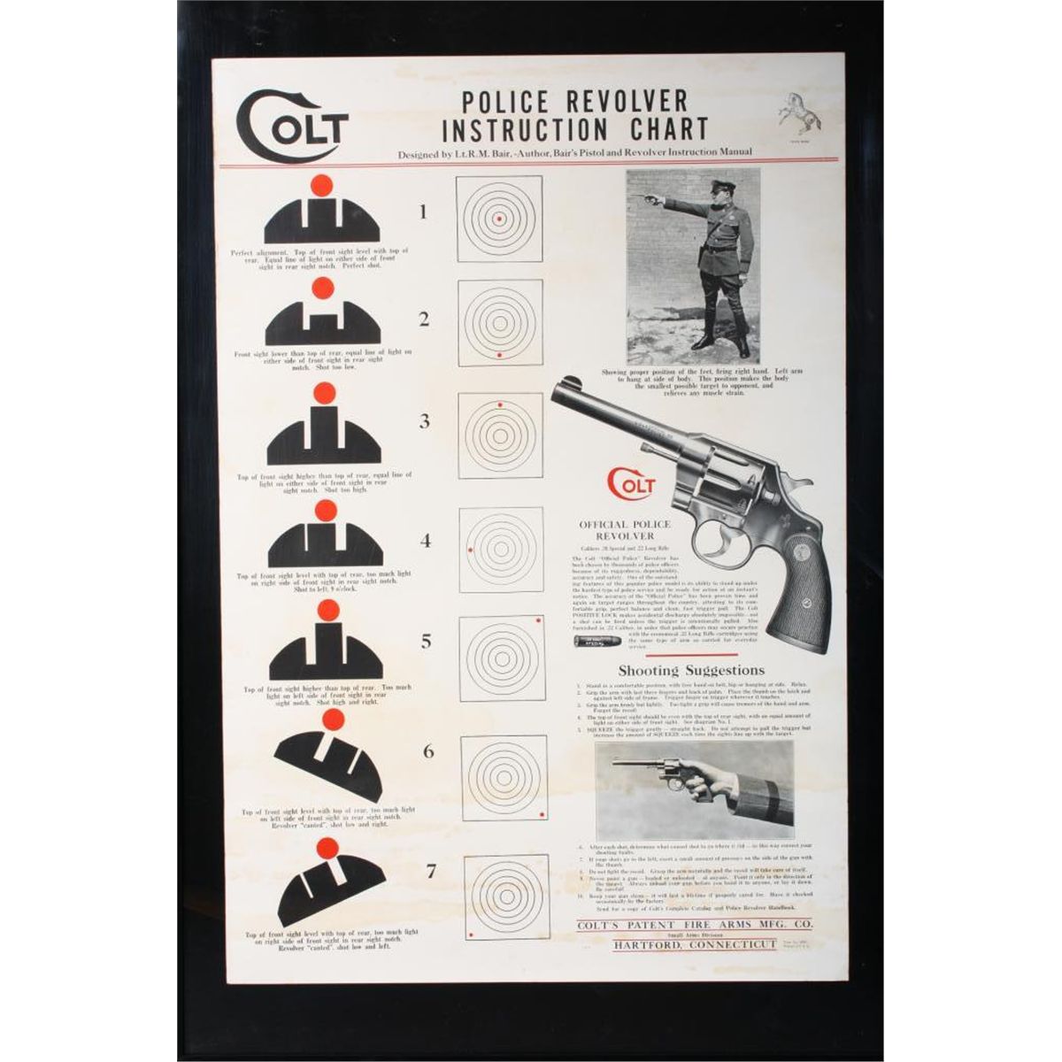 Early Colt factory advertiser dated “6-43” and entitled “Police Revolver Instruction Chart” approx. 34” x 23” showing a Colt Official Police DA revolver with a photos of an officer’s stance in pointing gun and thesame officer’s hand demonstrating the proper grip with seven sight pictures and descriptions; the advertiser is in overall very good condition with some scattered yellowing; would be great to frame and hangin the gunroom or at the range. Est.: $300-$600.