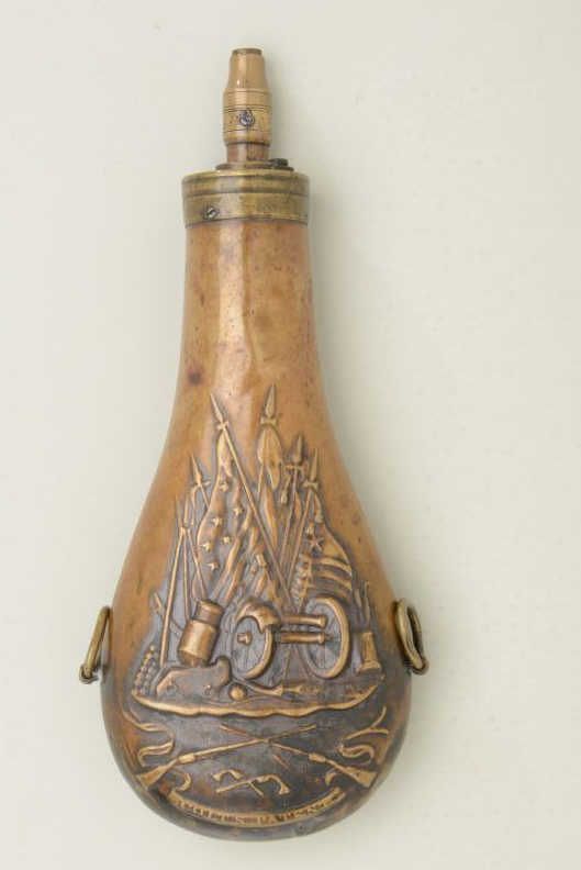 Early Colt patent marked powder flask, circa 1840s, type associated with Patterson long arms and early Colt Dragoons. The bottom of the flask shows Colts patent, stand of arms, crossed rifles and pistols and fully visiblerings on mortar. The flask is mounted with triangular rings at the bottom and shows Colt marking on ball door cover. The condition is good, showing some opening on the seam at the bottom; 20-30% lacquer that's gone dark,some minor dings, mars and normal aging. The plunger and small parts are all original. Many of these found in Texas, and old collectors feel they were used with the Patterson carbine and early dragoons. Est.: $1,250-$2,500